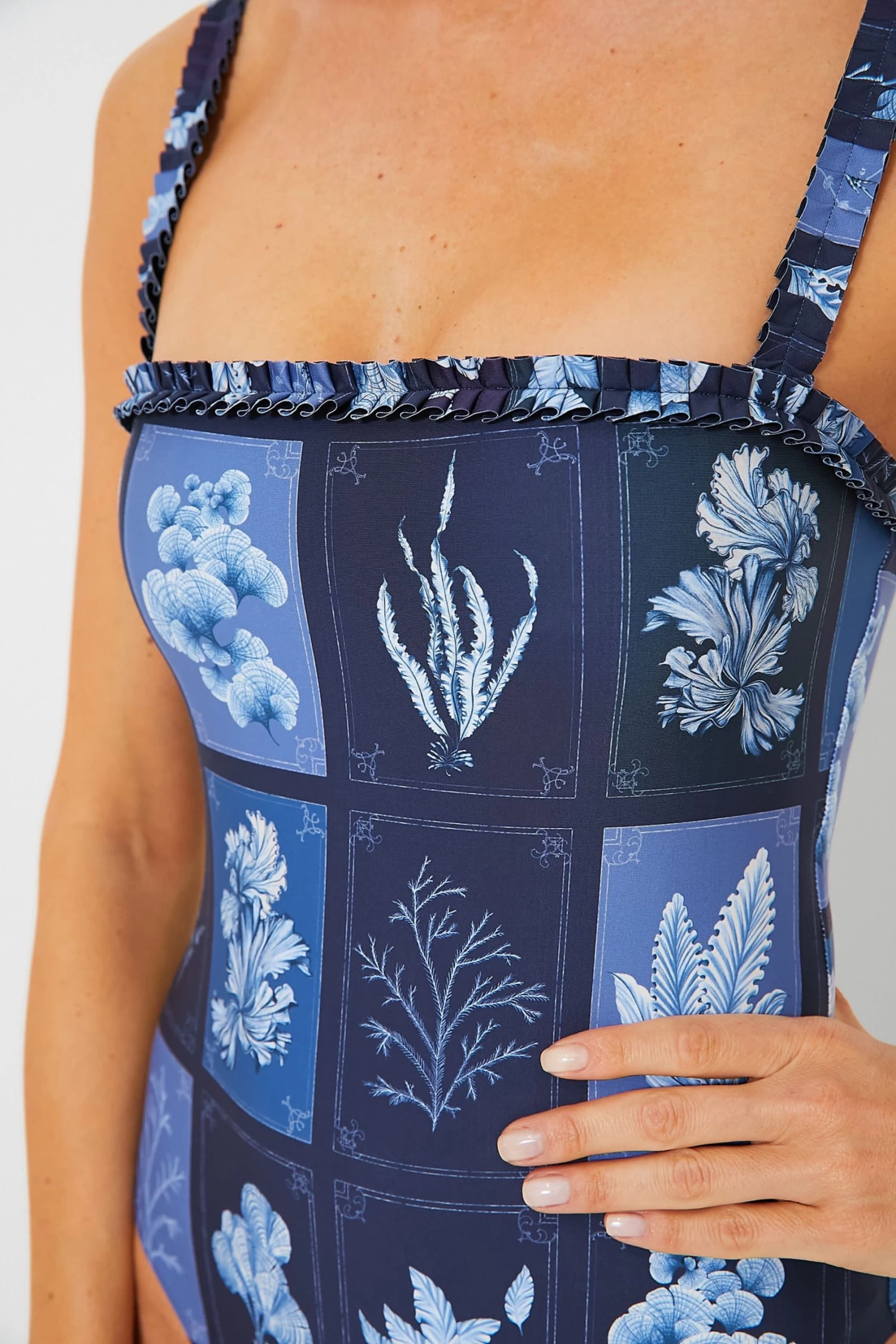 - Ruffle straps and neckline