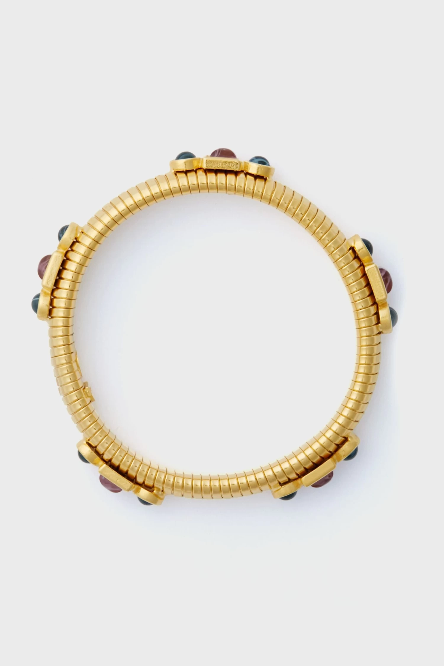 The Amber and Sapphire Byzantine Cobra Bracelet ensures you shine with opulence and grace. Handcrafted with 24k gold-plated brass, this bold accessory features mixed glass stones. Perfect for special occasions, formal events, or as a statement piece, pair it with everything from a cocktail dress to a casual blouse and jeans for an extra touch of shine.