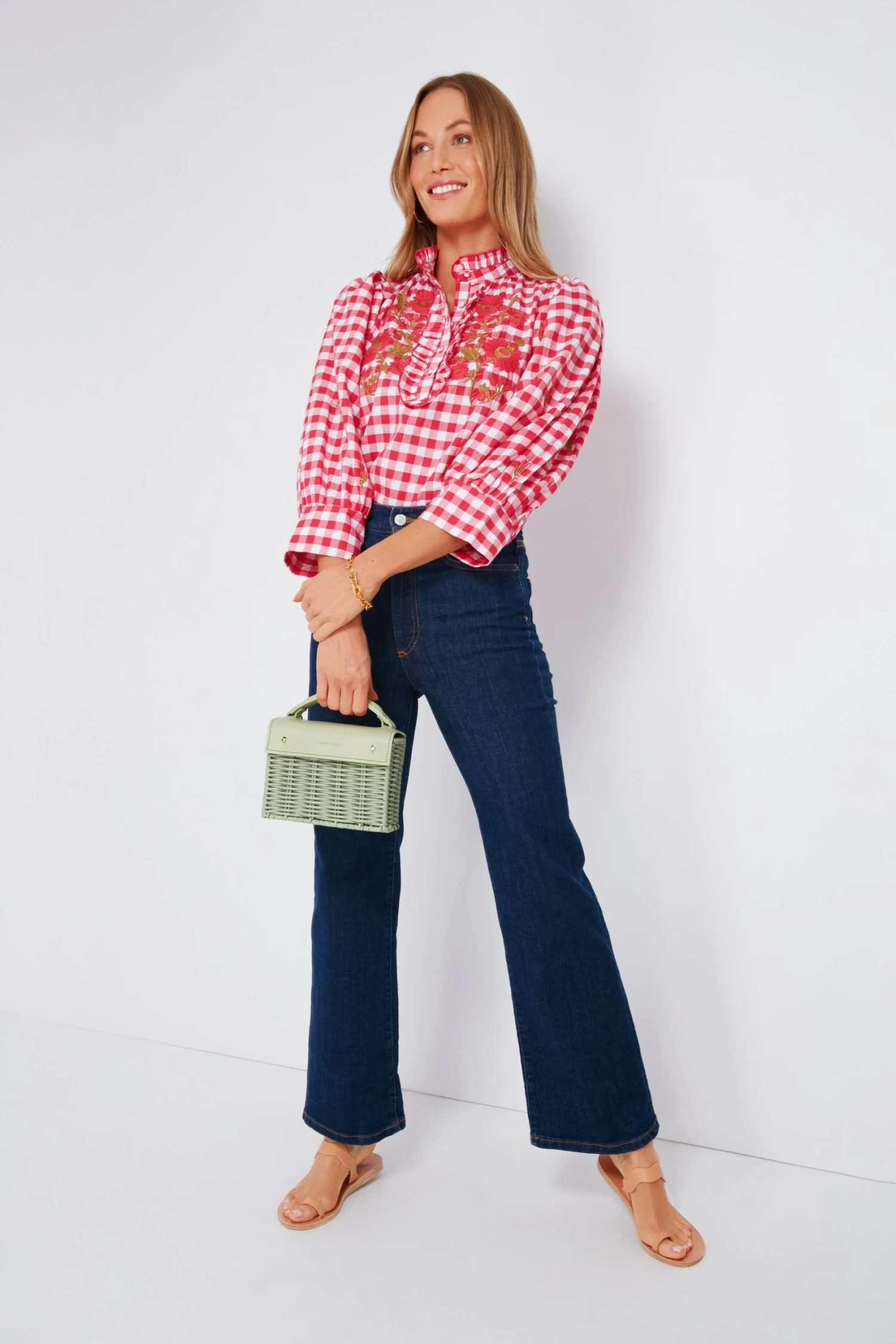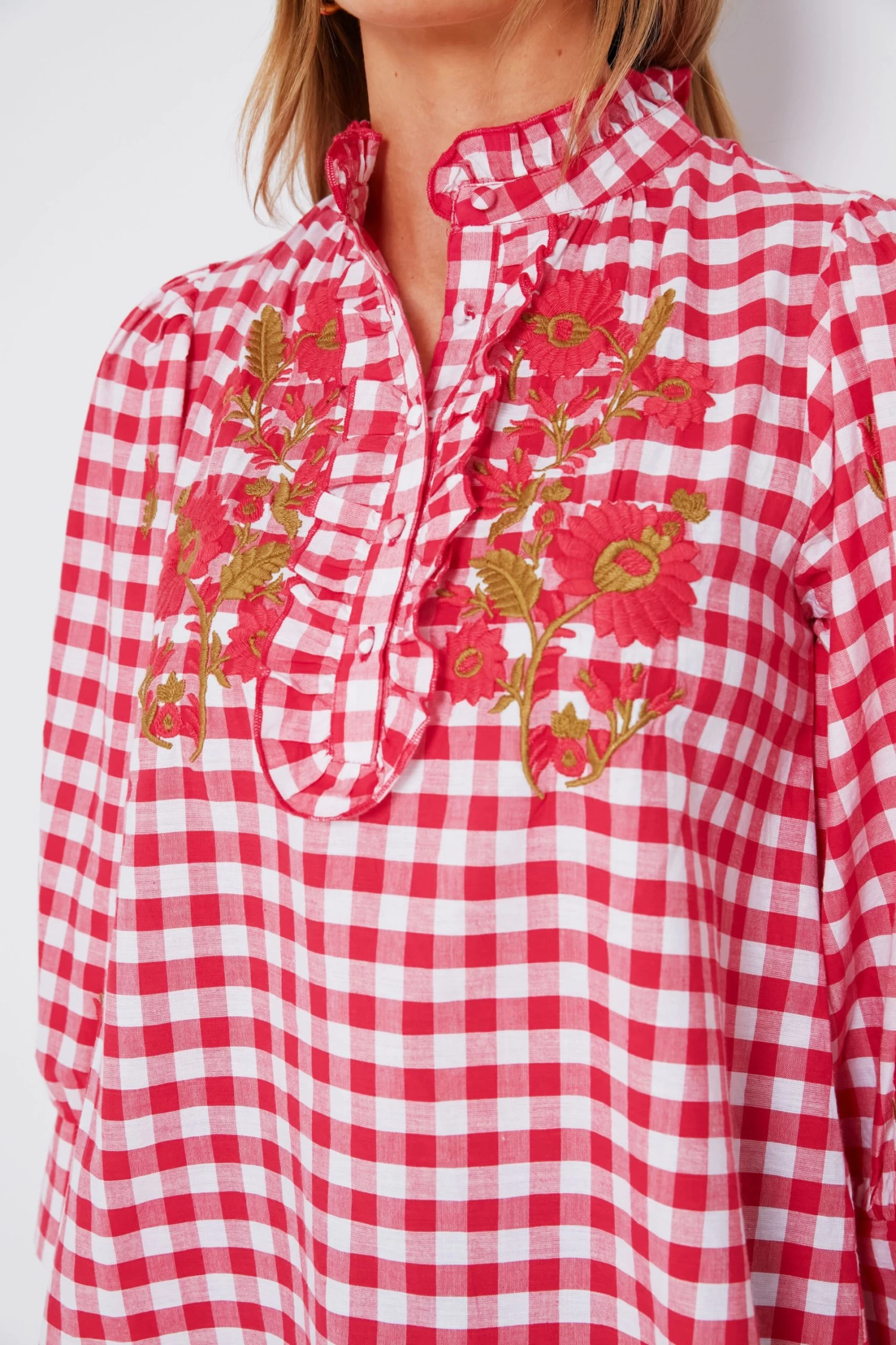 Picnic-inspired gingham AND florals?! We are loving the whimsy of the Red Polly Blouse with its fresh take on the classic Vichy checkered blouse â and exciting new details like a stand collar, ruffled placket, and covered buttons. Brighten your day and your outfit with this puff sleeve piece, just add your favorite denim and sandals for a morning at the farmers’ market or a casual stroll through the park with an iced lattĂŠ in hand.Â