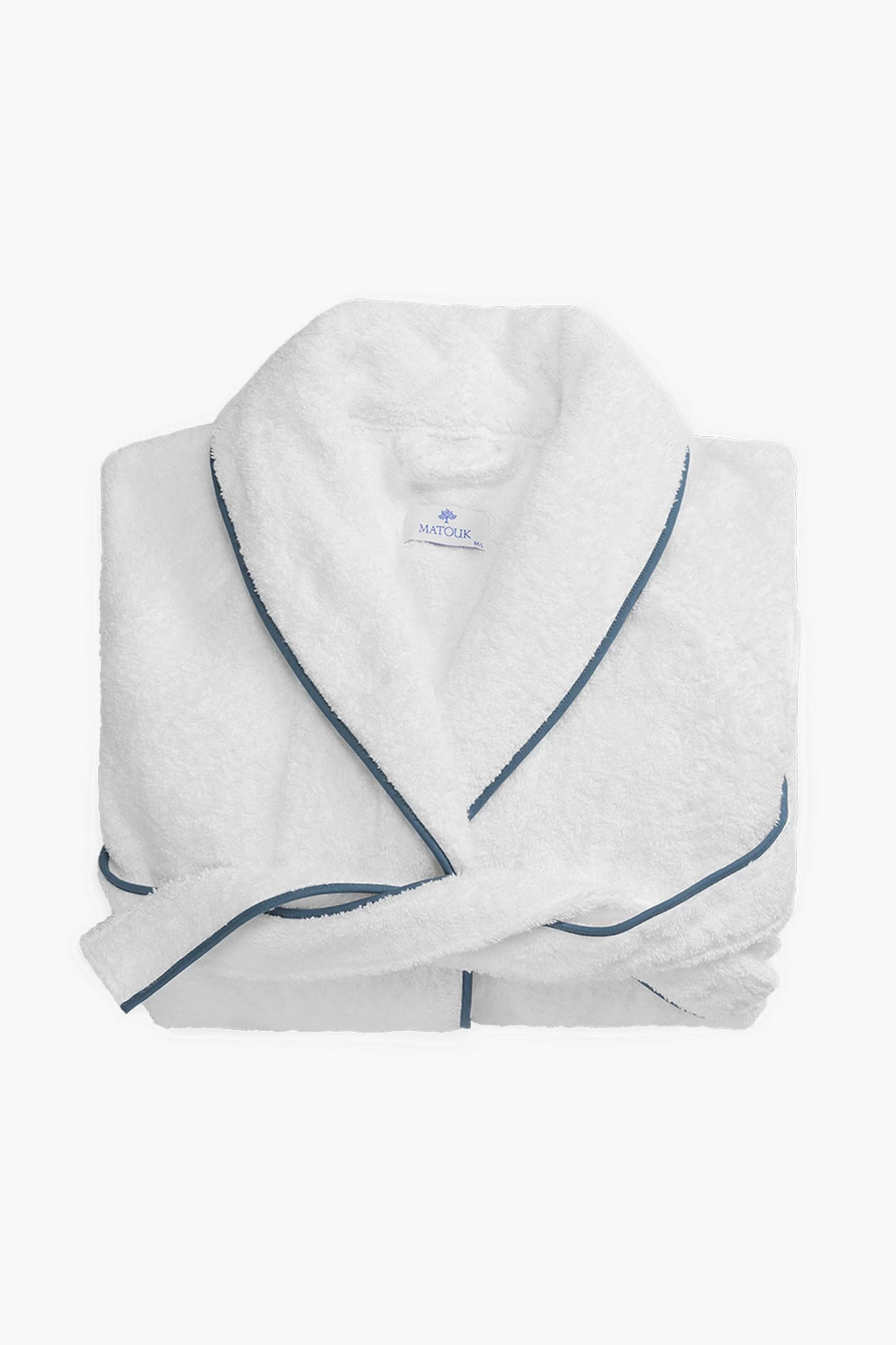 A long cotton terry robe is a staple in our closets. With a simple, bias-tape blue piping detail, this fluffy style will make you feel like you escaped to a luxury resort. Pair with slippers and pajamas for the ultimate at-home cozy combination.