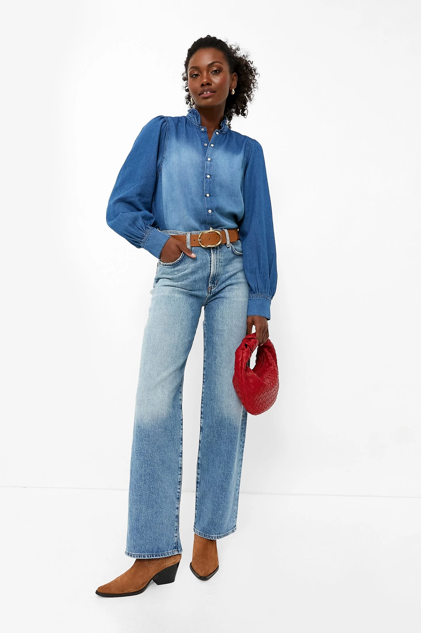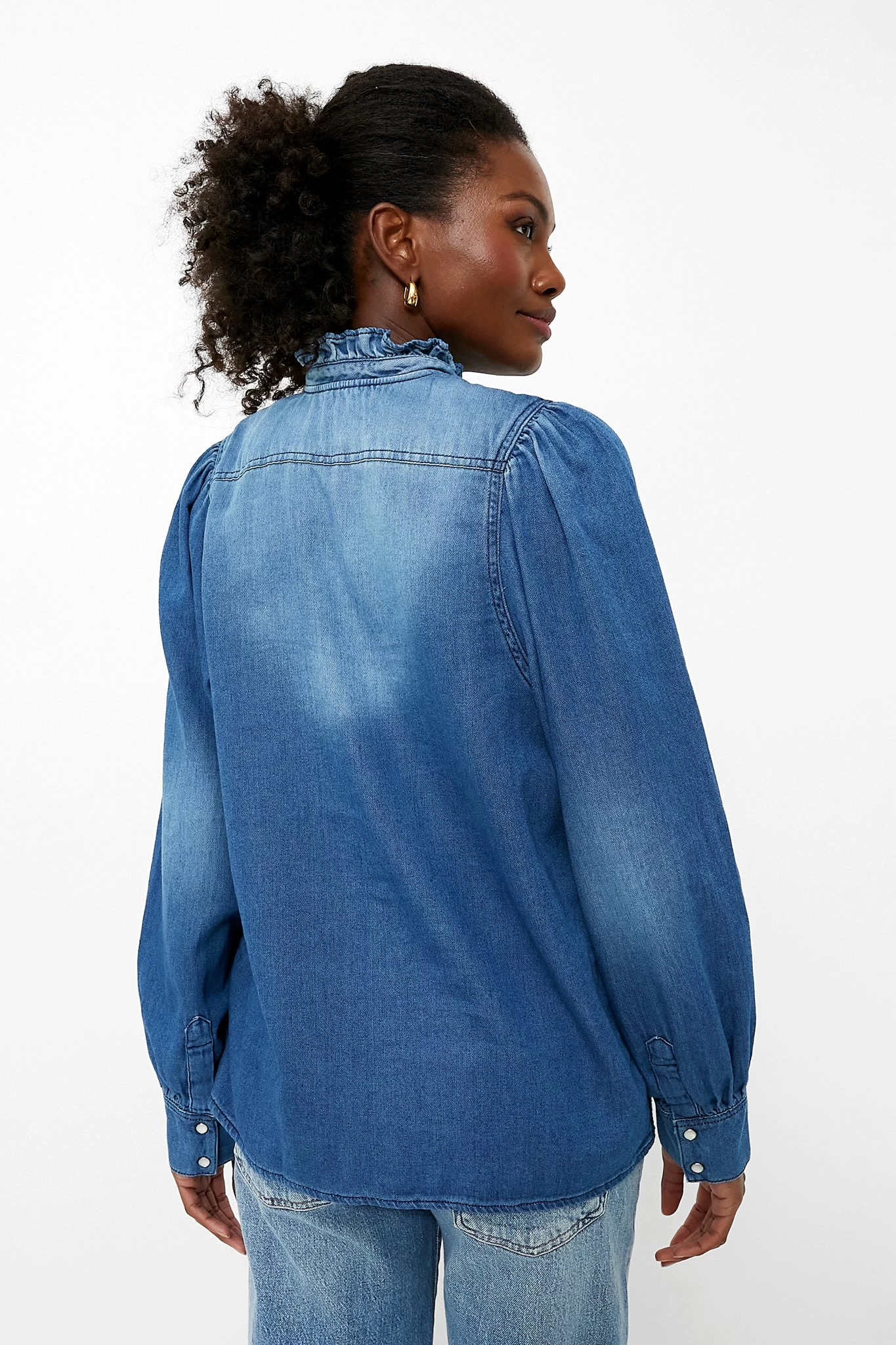 Take classic chambray and give it some feminine touches — then you’ve got the Light Used Blue Axelle Shirt. Featuring a ruffled collar, blouson sleeves, and mother of pearl snaps at the cuffs and all down the placket, this silhouette is nothing if not charming. Pair it with denim to go full cowgirl, or try it with a mini skirt and knee boots for a modern styling.