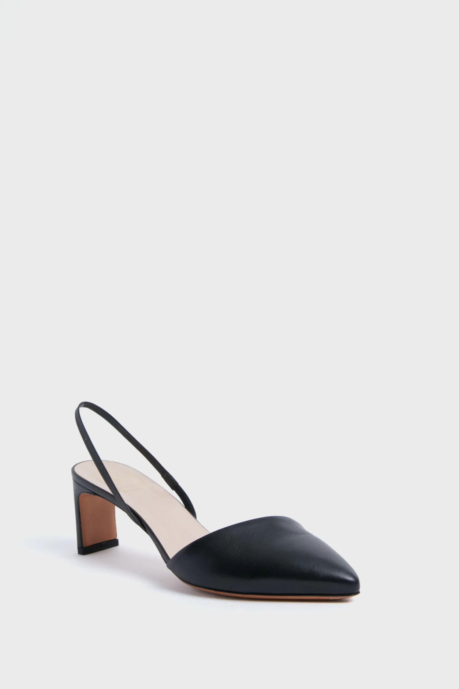 A classic, chic kitten heel is a closet essential for every woman. The Black Leather Frankie Angled Slingback takes this beloved silhouette and upgrades it with an asymmetrical toe box and rectangular heel. Wear with denim and a black blouse for a work-casual look, or pair with a sleek maxi dress and gold jewelry for date-night.