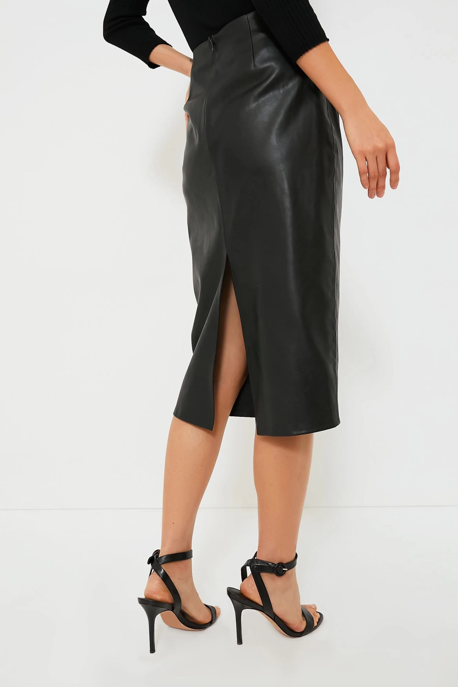 A sleek silhouette that is fitted through the waist and falls straight down from the low hip, the Black Leather Monica Skirt is exactly what your closet has been needing. With finishing touches like ruching that flatters the figure, a back zip closure for easy styling, and a daring back slit at the hem, this midi is the life of the party. Pair it with a tailored blazer and loafers for the office, with a bodysuit and heels for date night, and with fabulous accessories any time!