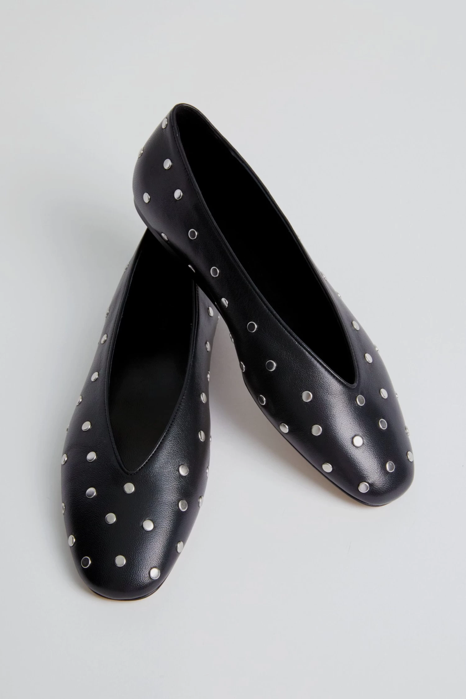 The Black Regency Studded Slippers are the epitome of effortless elegance. Featuring a rounded toe, a comfortable and cushioned calf leather insole, and a luxe leather composition, these are a lovely pair of flats to wear from desk to drinks and everywhere in between. Classic and feminine with a touch of edge, these shoes pair well with jeans and a cardigan or a blouse and skirt for an easy yet chic day-to-night option.