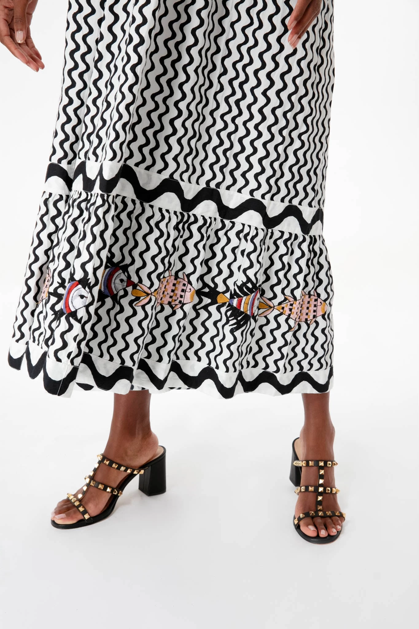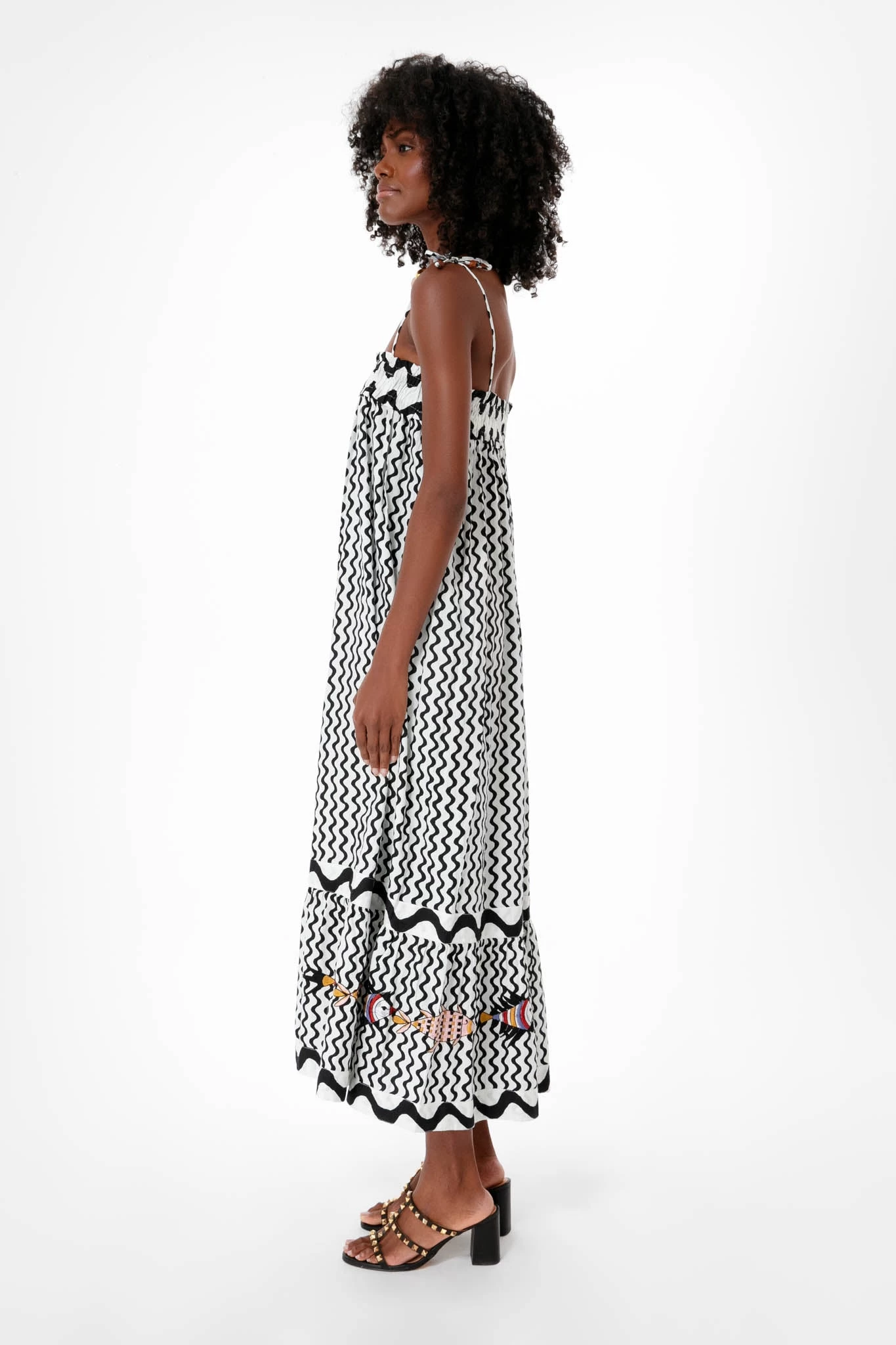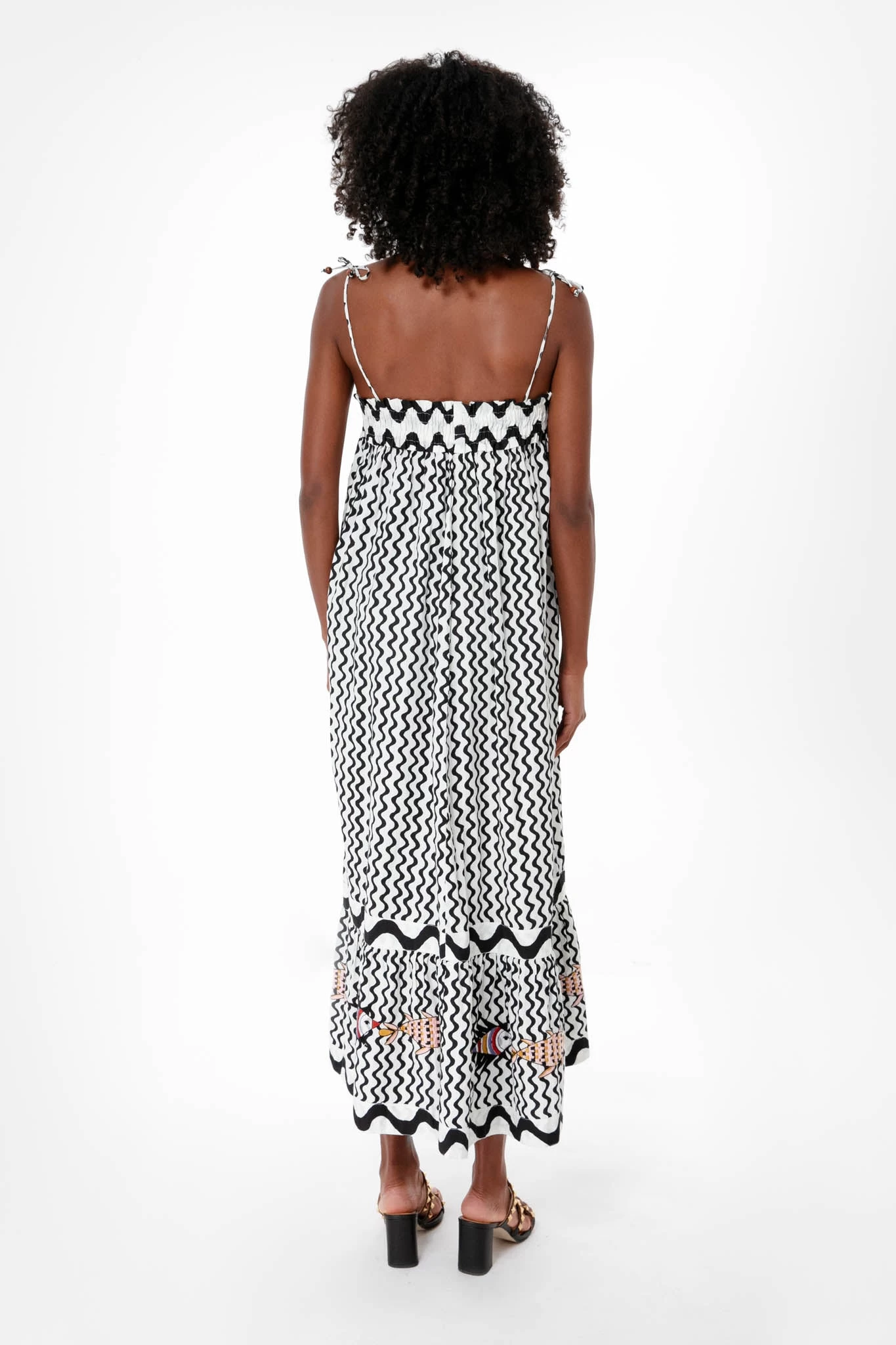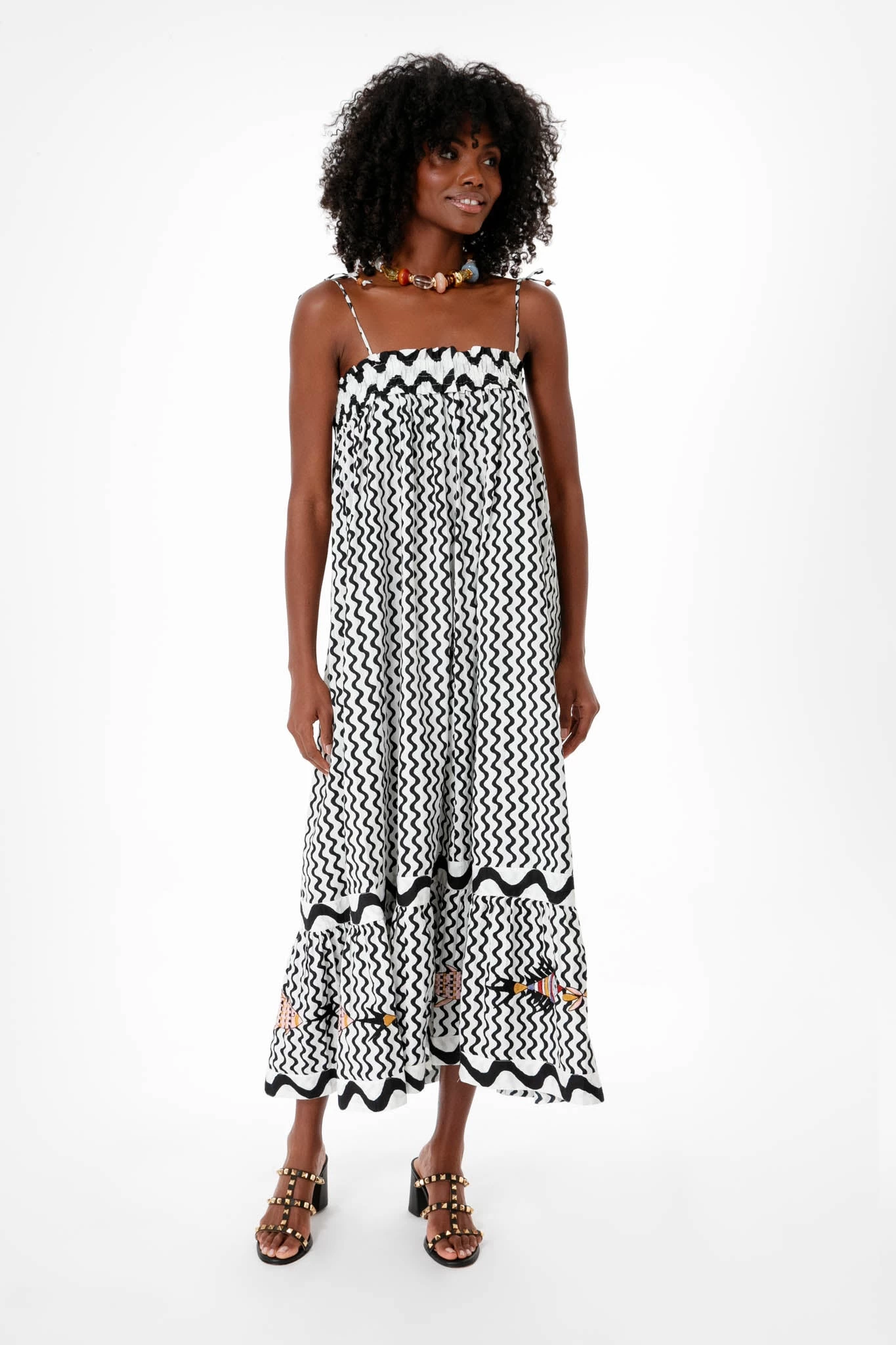 Daring prints, simple silhouettes, cool fish motifs- must we continue? The Black Ripple Straight Dress is the fun and fresh vacation piece that you need for your next getaway. Featuring spaghetti tie straps, smocking details at the bodice, and a wavy stripe illusion that’s finished with colored fish at the hem for an unexpected twist, you’ll be sure to make a splash with this midi. More is more, so bring on the colorful statement jewelry and heels for a bold resort look.