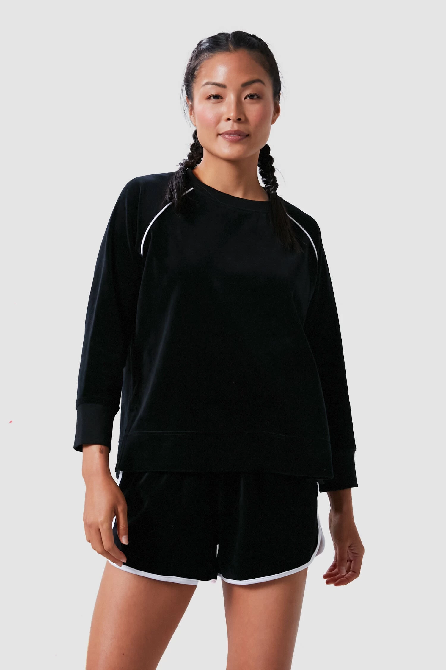 Nothing screams 2000’s luxe athleisure more than a velour tracksuit, introducing the Velour Maggie Pullover. Cut in a super soft plush fabric, this raglan number features matching black grosgrain side seams and contrast white piping for added detail. Lounge in it all morning, then step out to hit the grocery without thinking twice. Double down on the throwback glam with the matching drawstring shorts!