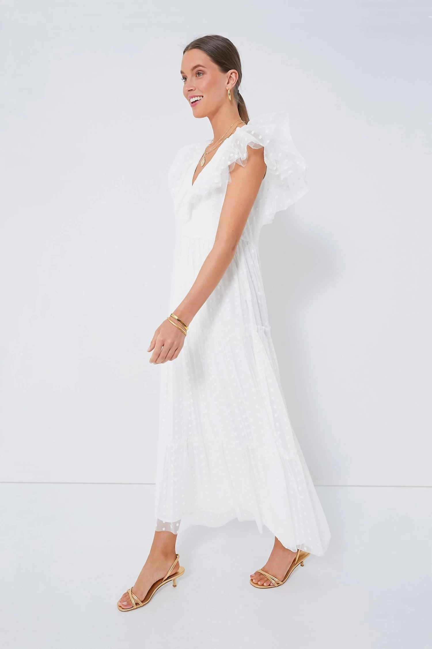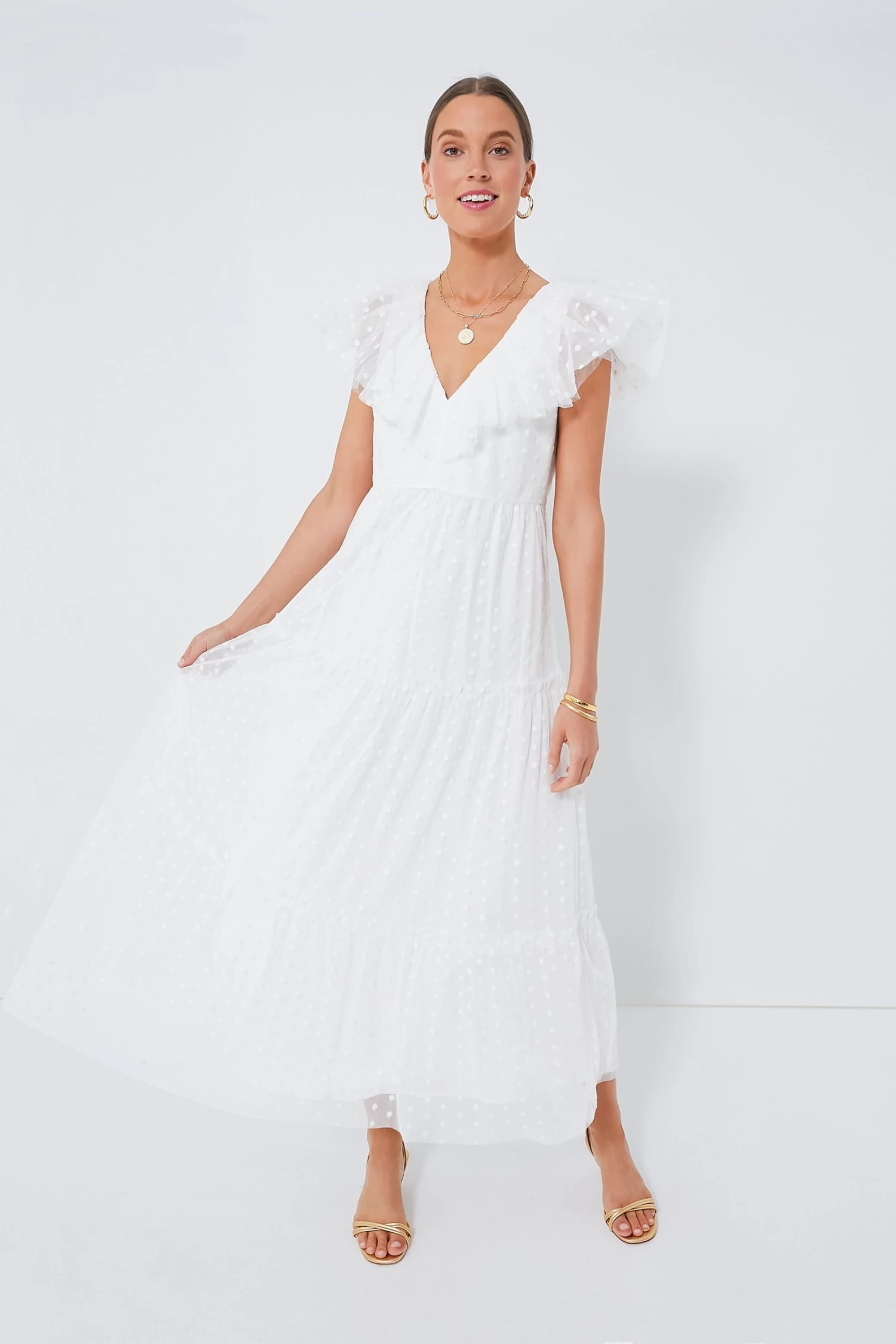 Fall in love with the Blanc Giselle Gown. Made to celebrate the feminine figure, it boasts romantic ruffle sleeves reminiscent of garden butterflies and a begging-to-be-twirled full length skirt. Delicate embroidered flowers atop the soft textured tulle complete this romantic design. Perfect for the bride or any elevated occasion, add heels and statement earrings, then get ready to dance the night away.