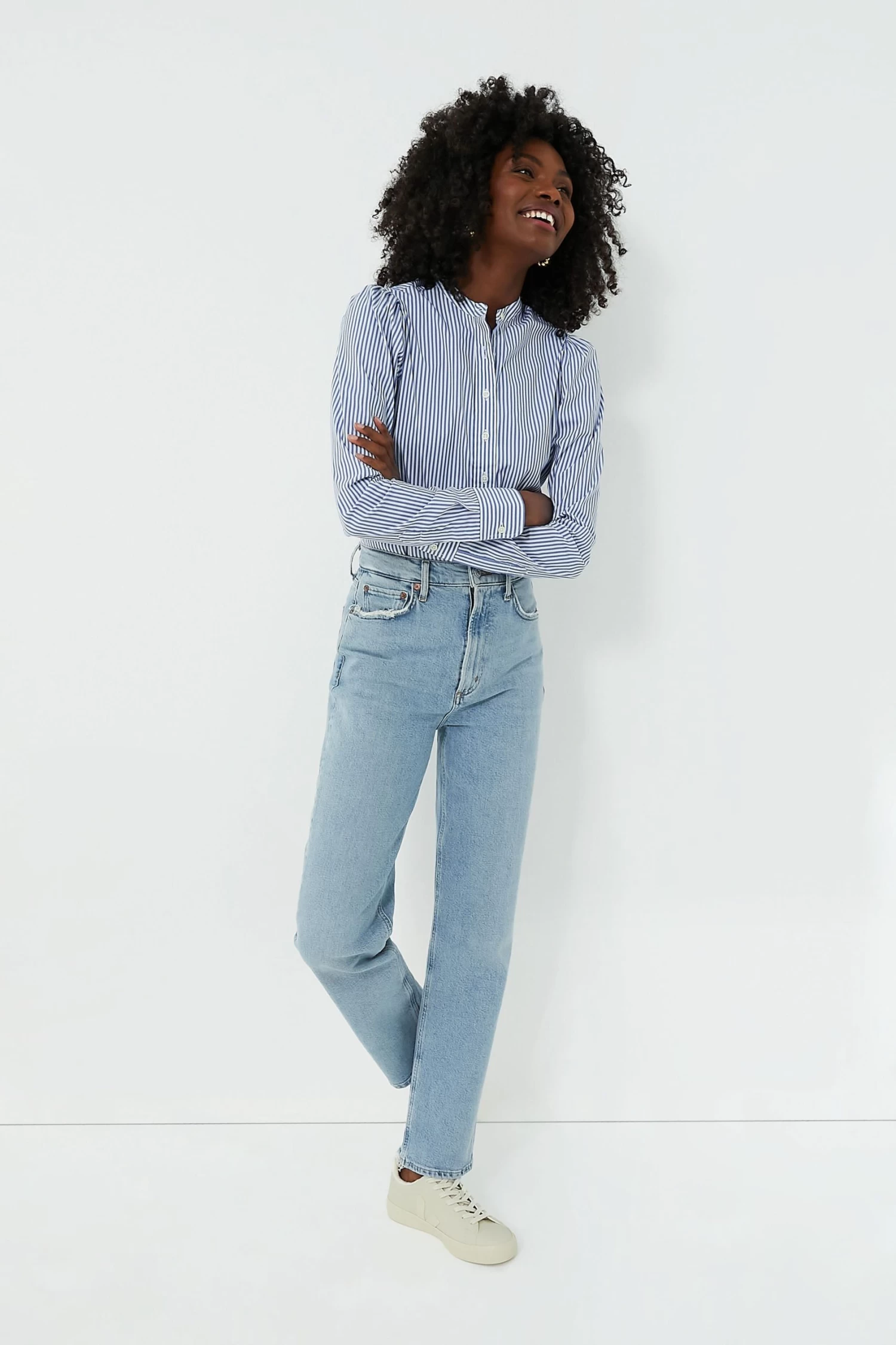 For business or pleasure, the Blue White Stripe Puffed Shoulder Shirt is shapely in all the right places with subtle gathering at the shoulders and a stand collar. Featuring long sleeves, a front button placket, and No Gape® button technology, this silhouette has got you covered (literally!). Beautifully made from cotton and produced in Portugal by local artisans, we are styling this piece with flared denim, pumps, and statement earrings for the perfect desk to drinks look.