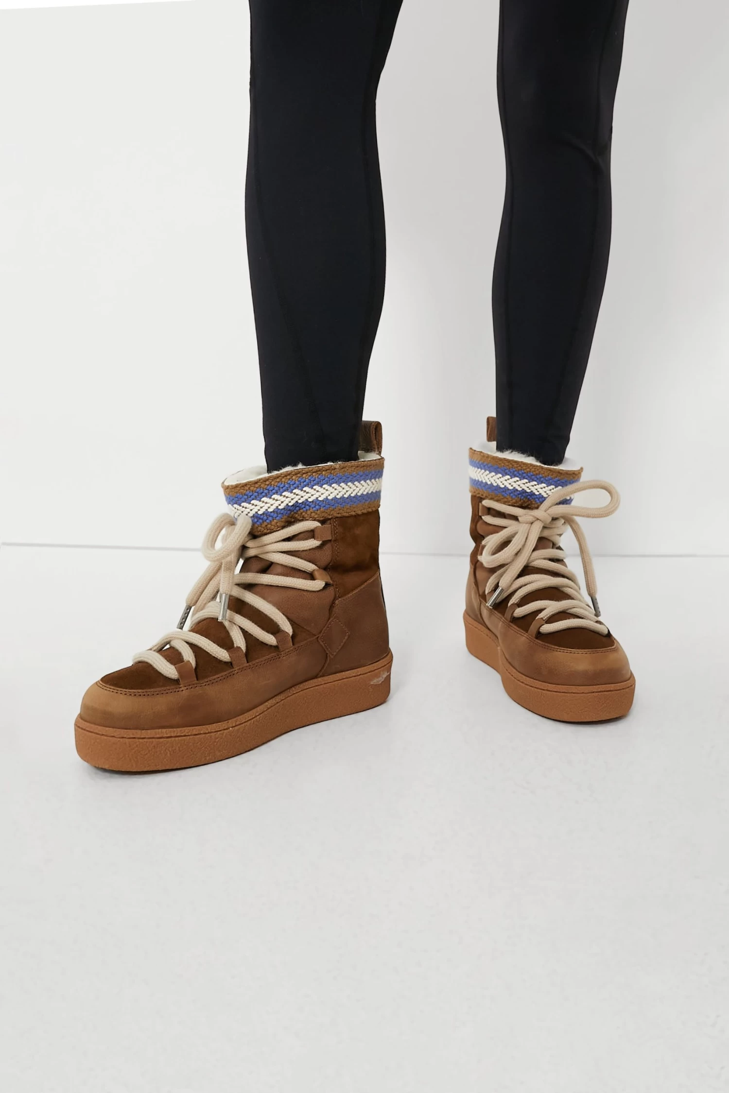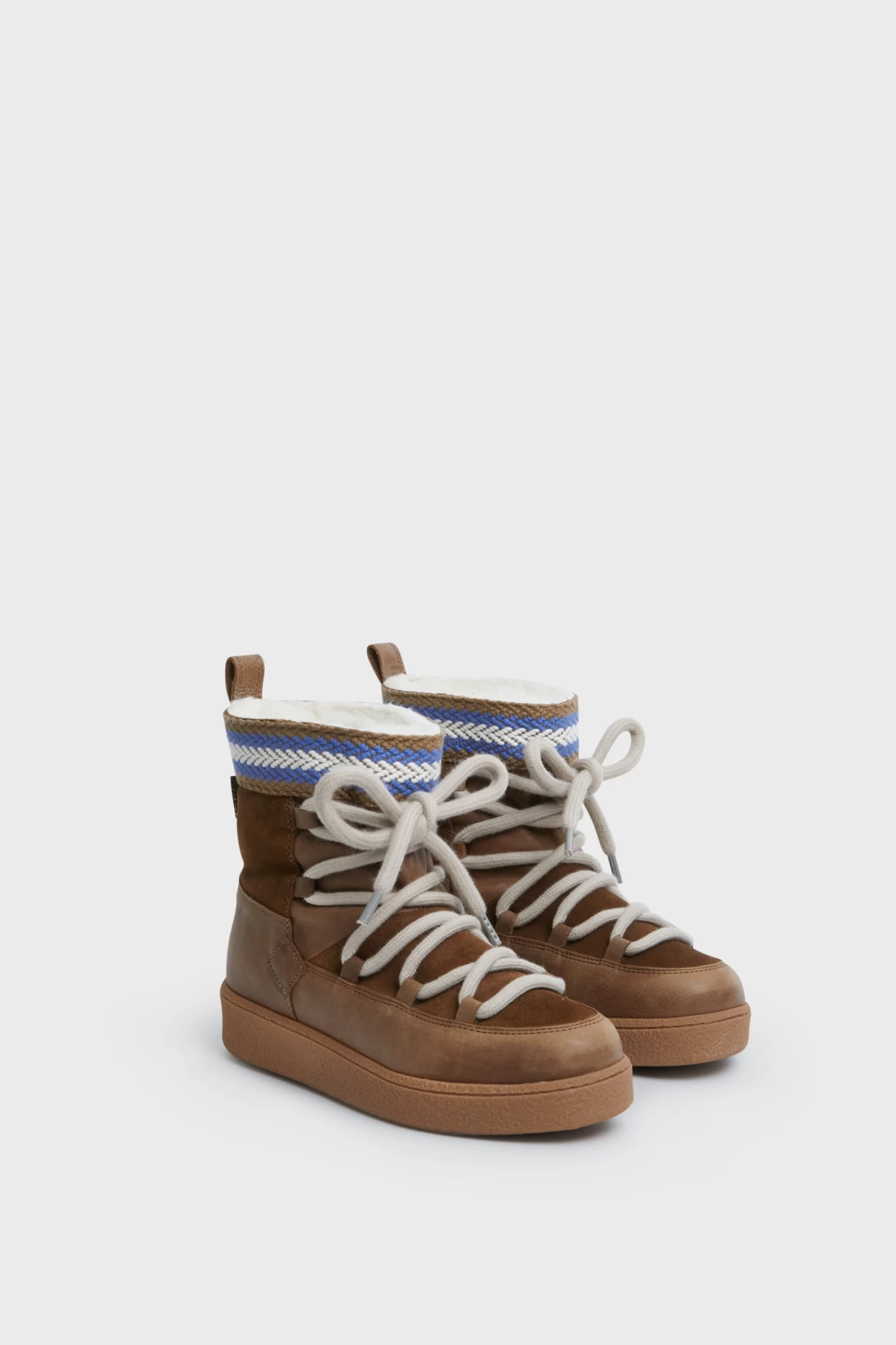 The Cosmos Boot is a luxurious snow boot for the coldest days, designed in sustainably sourced suede and leather with organic cotton stripe trim. Fully lined inside with 100% wool for superior warmth and comfort. This simple style with chunky laces is an easy pull-on, stylish, and practical for life on the go.