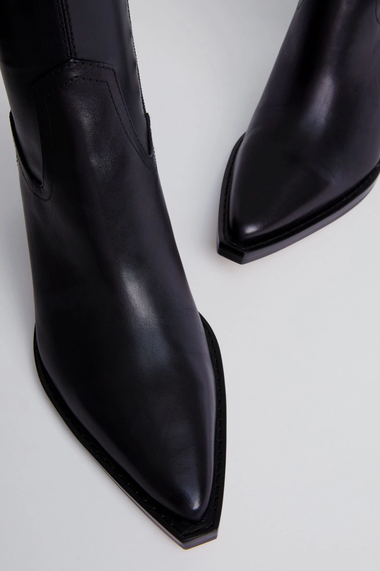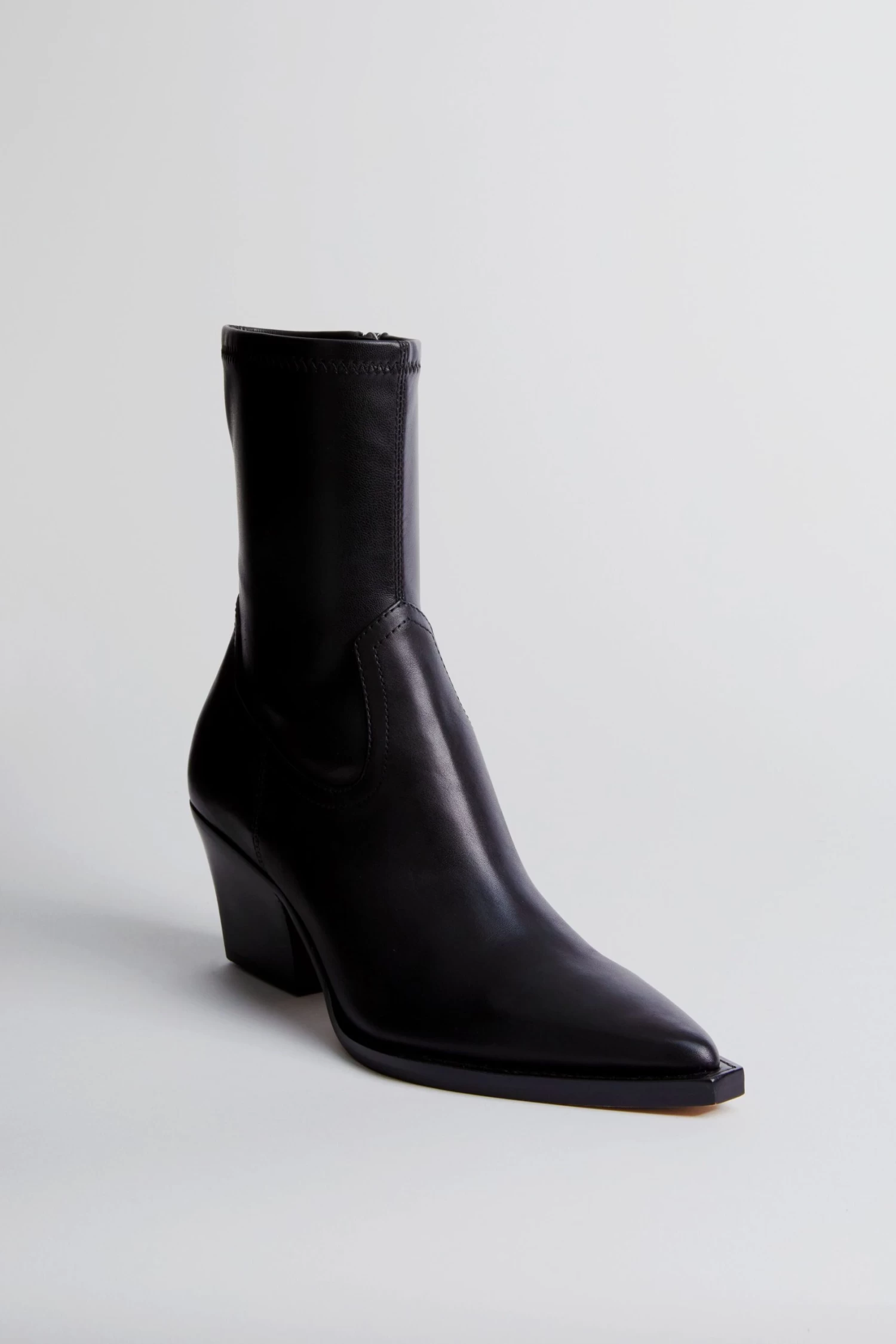The Black Rutger Booties are sleek and sophisticated! Designed to complement midi-length skirts and dresses as well as all lengths of denim, we love these leather beauties with their chunky heel and pointed toe for an edgy touch. Pair with a cozy sweater and flares for off-duty weekend style with plenty of cool-factor, or style with a flirty frock and gold jewelry for happy hour with your girls!