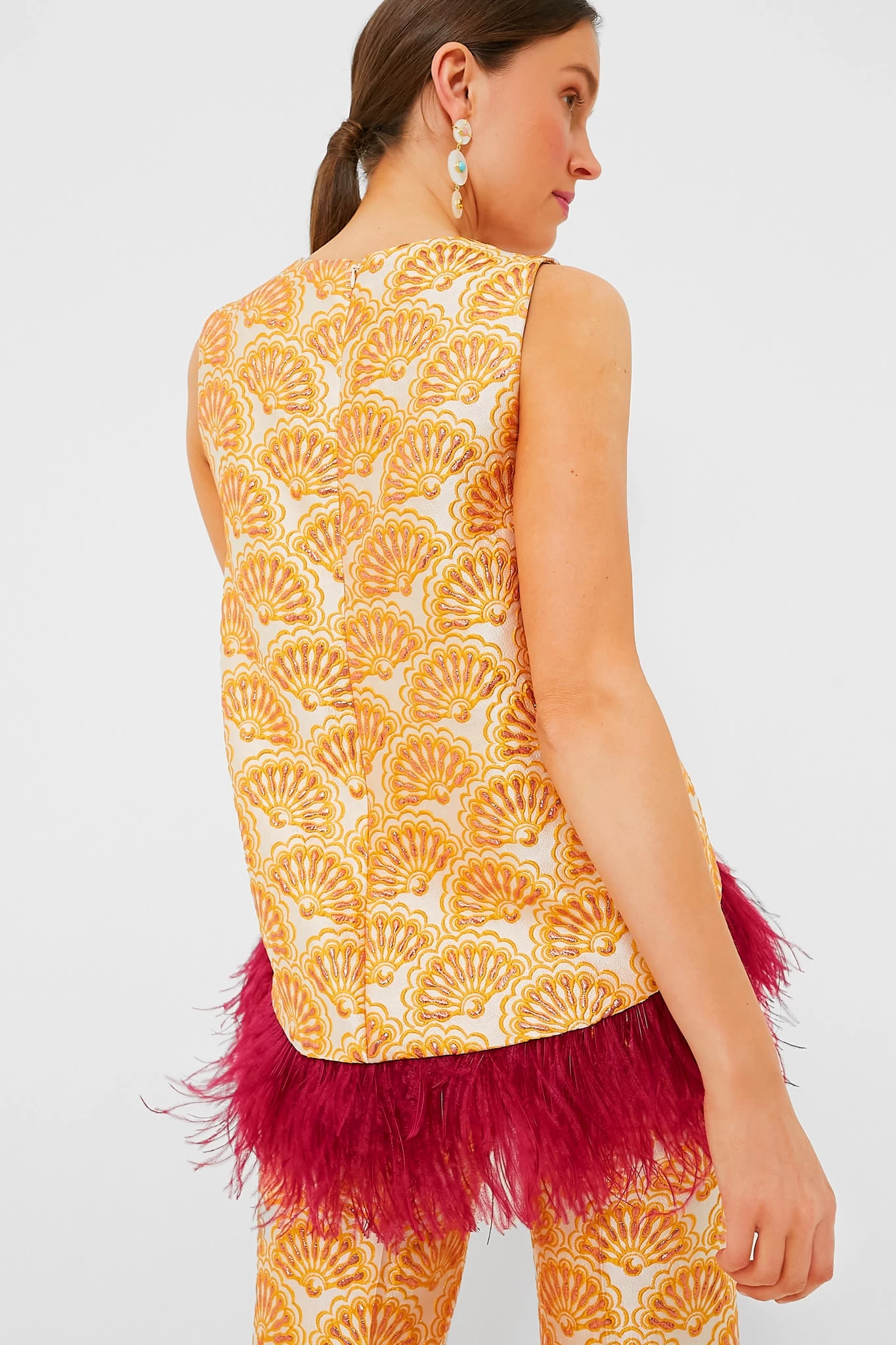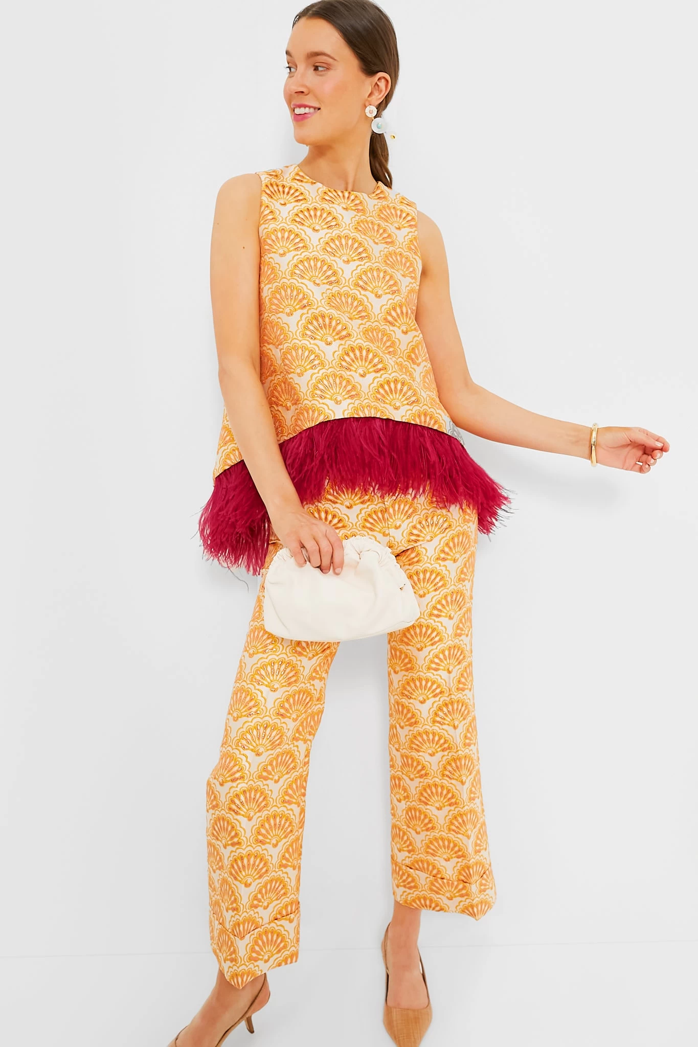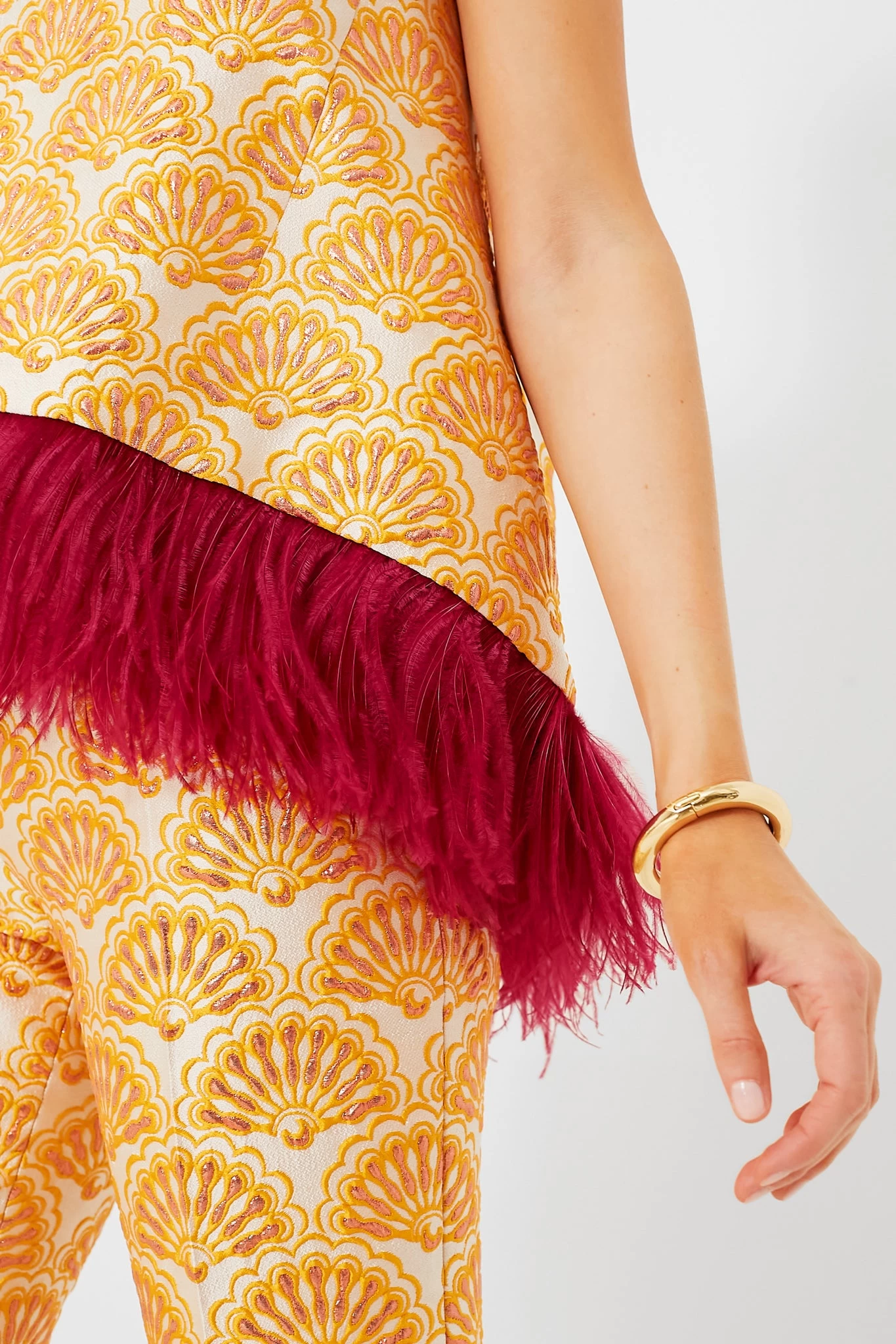 The Jacquard Fans La Scala Top wins the gold in our books! Prime for summer weddings, black tie beach parties, and beyond, this alluring trapeze silhouette is crafted from a shimmering jacquard fabric and hemmed with a fabulous ostrich feather trim that brings the drama. Style with the matching Jacquard Fans Hendrix Pants for a chic-coordinating look, or it slips in effortlessly with any denim and ballet pumps for a fun brunch look.