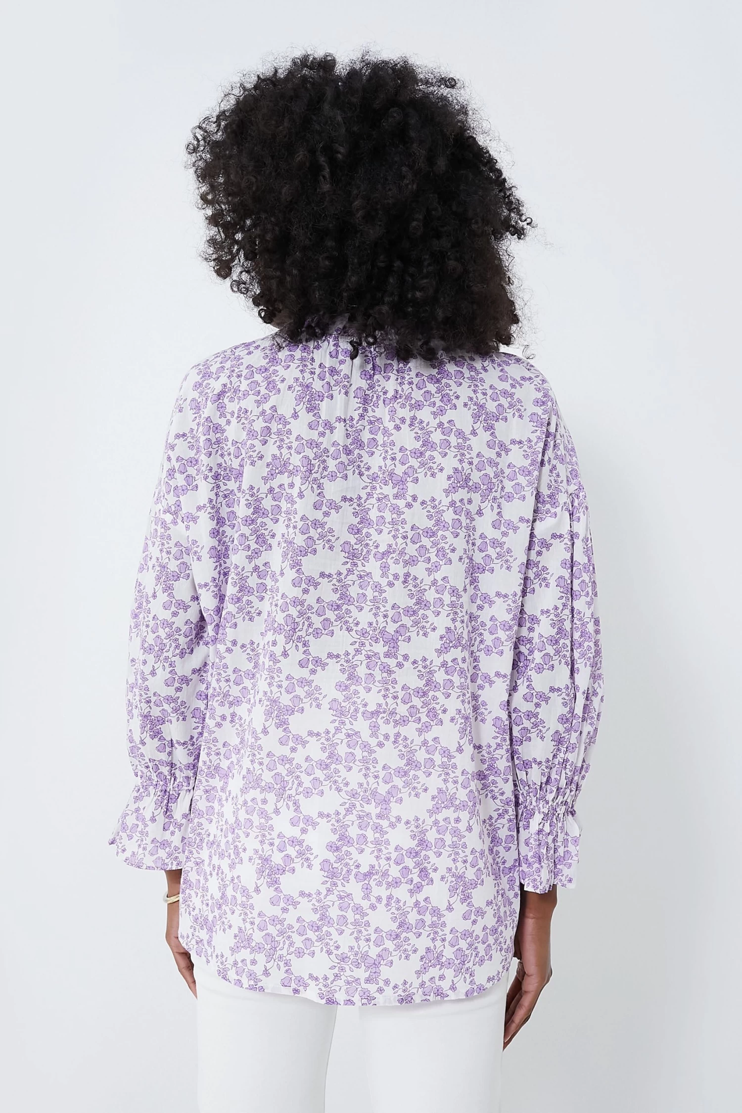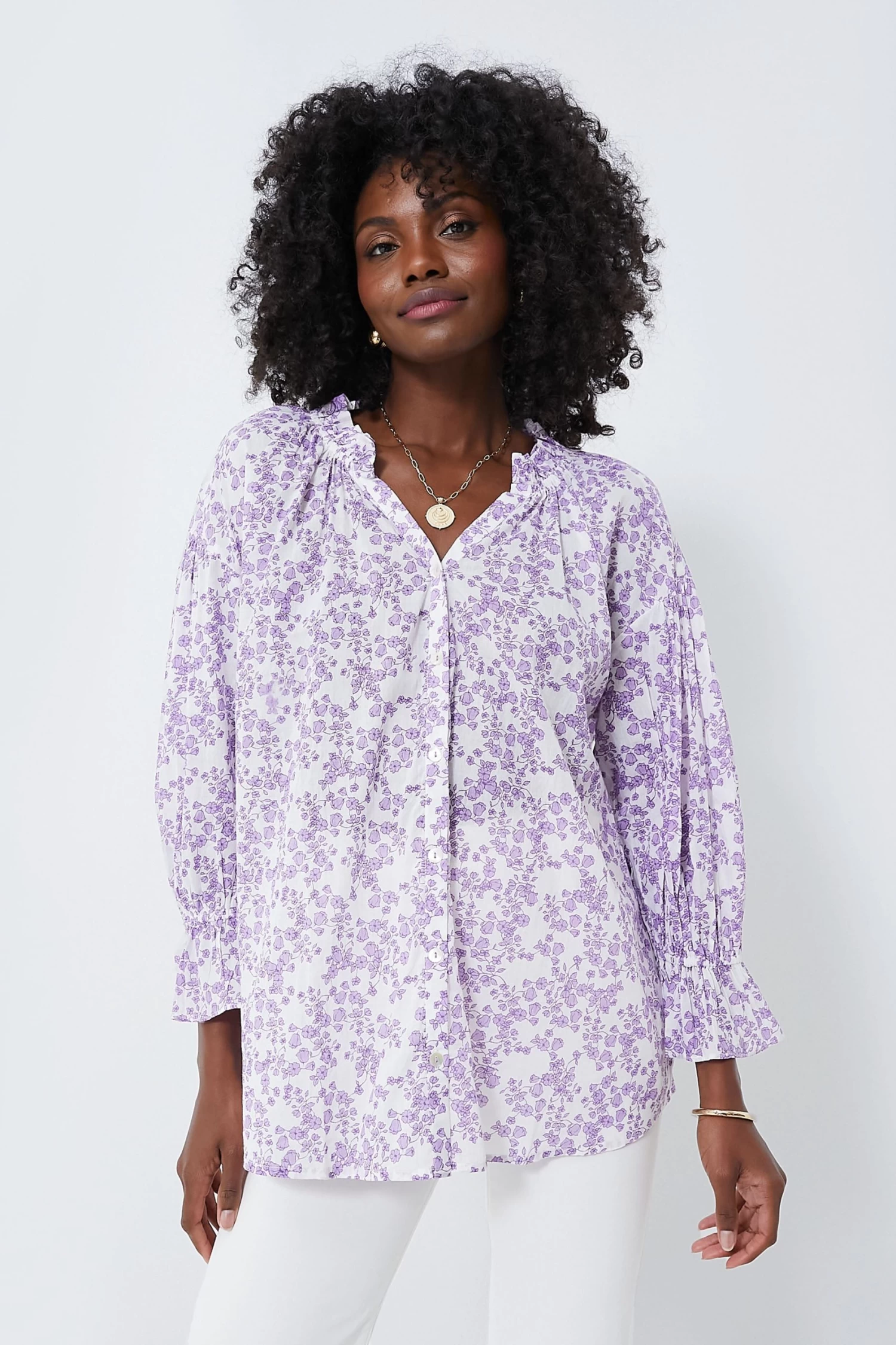 In that perfect pale purple and white color palette we all love for this time of year, the Lilac Lucrecia Rachel Shirt is effortless and exudes relaxed femininity. A ruffled collar and cuffs provide a hint of maximalism that complements the simple button down placket and rounded hem and makes this top feel extra special. Pair with any shade of denim, as well as sandals or sneakers — this summer style staple looks good with anything.