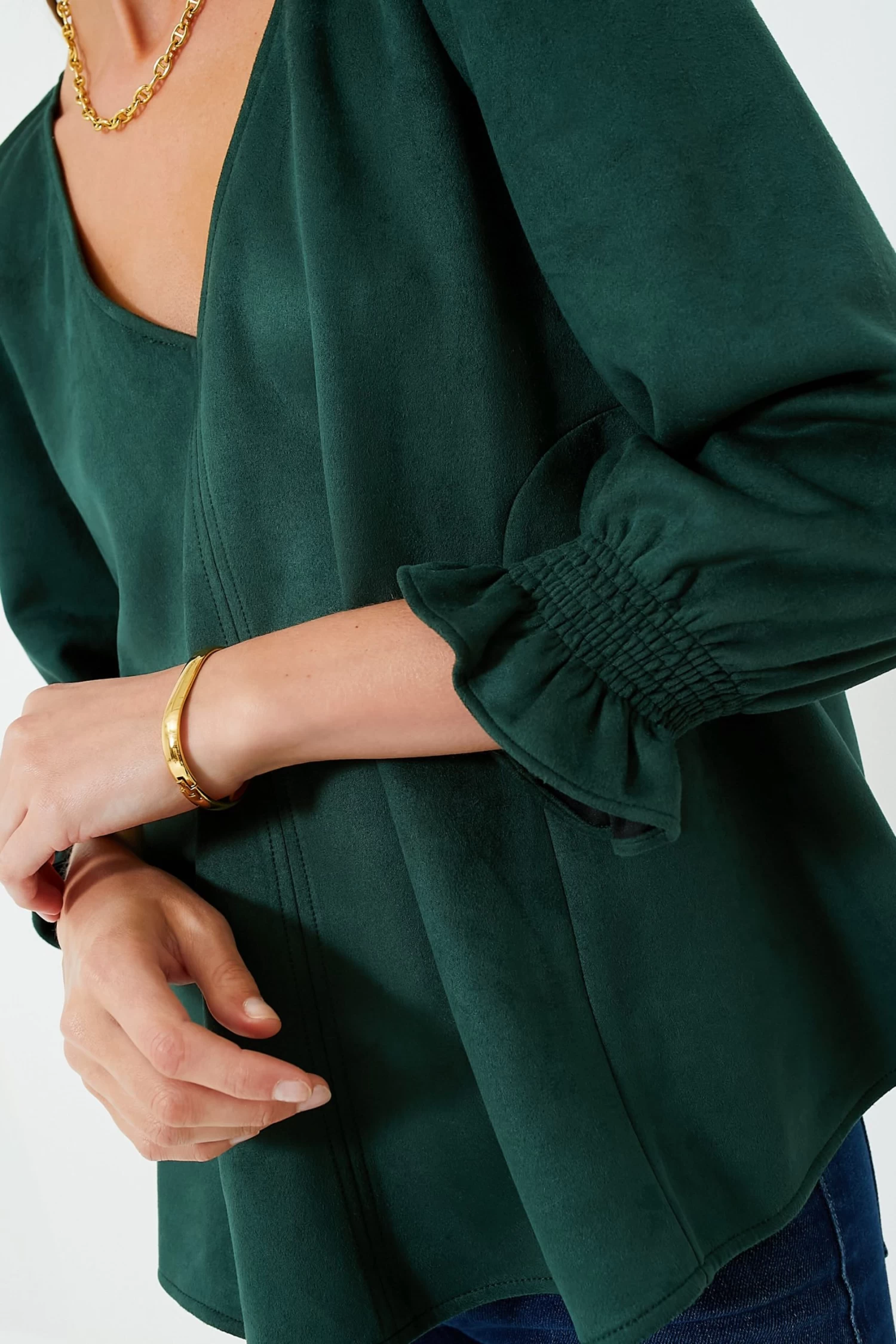 Simple with an unexpected twist, the Malachite Suede Easton Blouse is detailed with flounce ruffle sleeves, a flattering V-neckline and a swing shape. Classic and feminine, we are pairing this with jeans or leather leggings for power-lunches, date night, and everything in between this fall and winter.