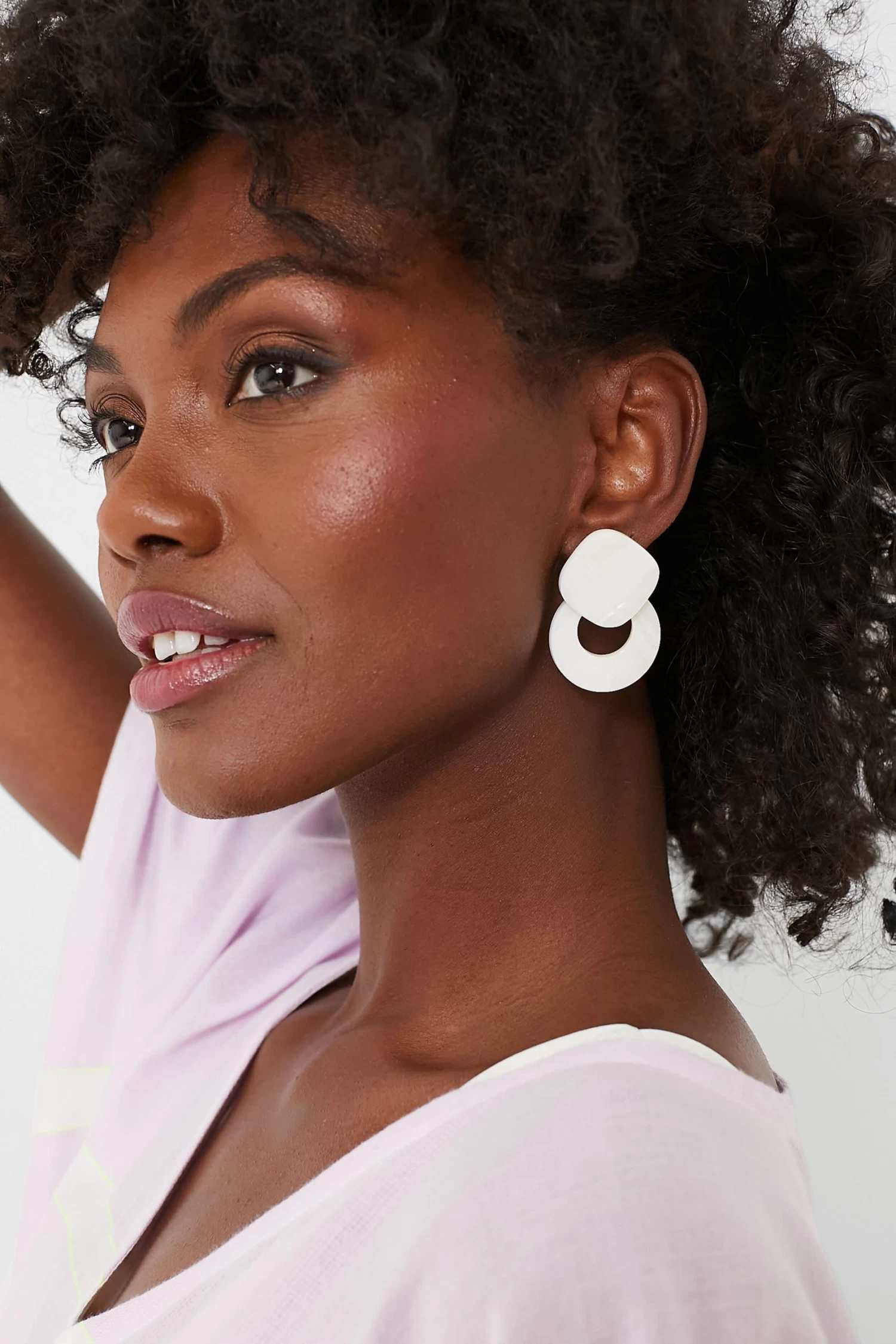 The Rae Earrings combine two fun abstract silhouettes– a mother of pearl square top with a matching hoop. These beauties are a fun and funky addition to any look, we love pairing them with denim and sneakers for an on-the-go day or with a floral dress for a spring refresh.
