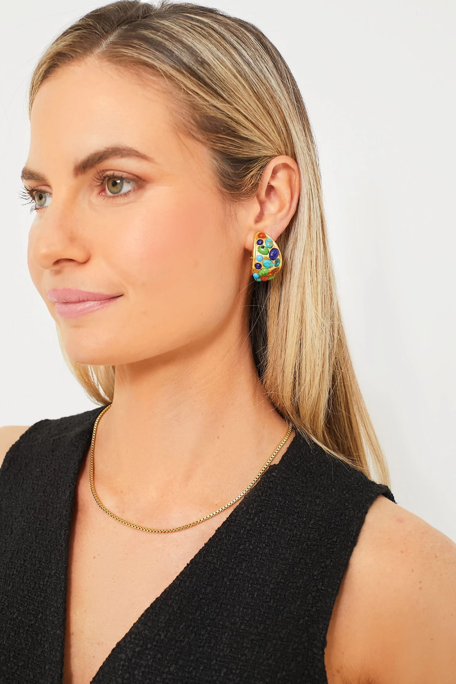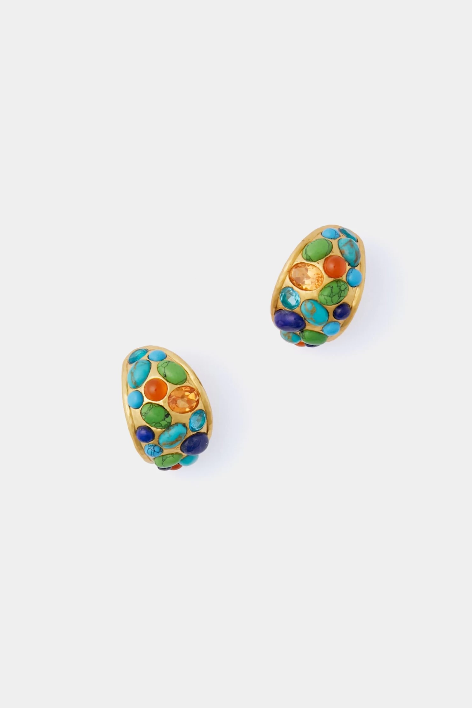 Shine and shimmer in the Multi Stone Alicia Earrings. Crafted in 24k gold-plated brass, these earrings display an eclectic collection of Turquoise, Lapis, and Quartz stones. Perfect for adding a luxe element to any outfit, we are pairing these with everything from denim and a white tee to a maxi dress and pumps.
