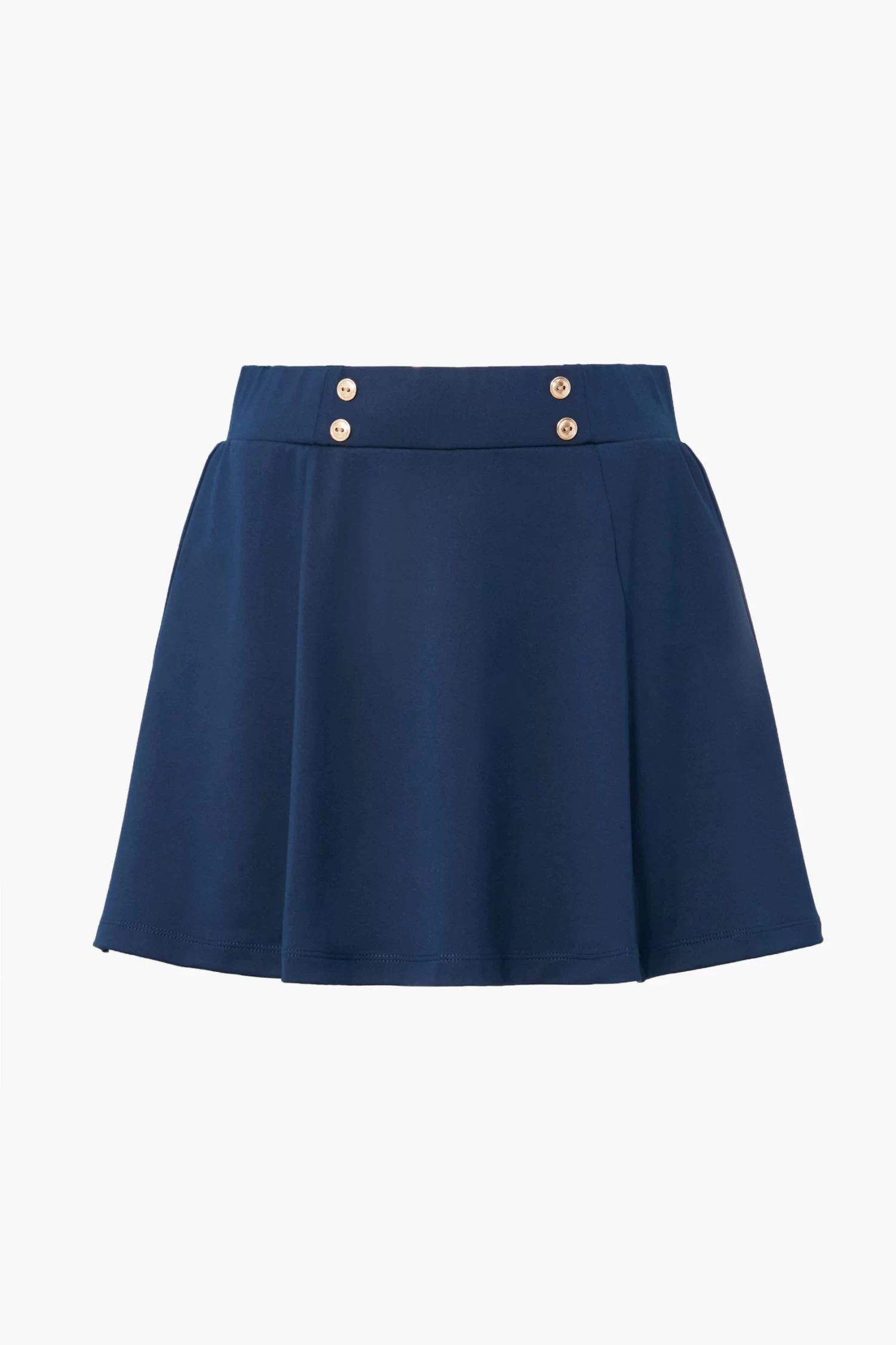 Look the part on and off the course with this retro inspired skirt. Slimming seams create a flirty fit on this A-line mini that plays well with a fresh polo tucked in to show off the gold button accents on the waistband. Detailed with red and blue floral printed compression shorts, ball pocket, and tee holders- the Navy 15 Inch Renee Golf Skirt has all the frills and none of the fuss.