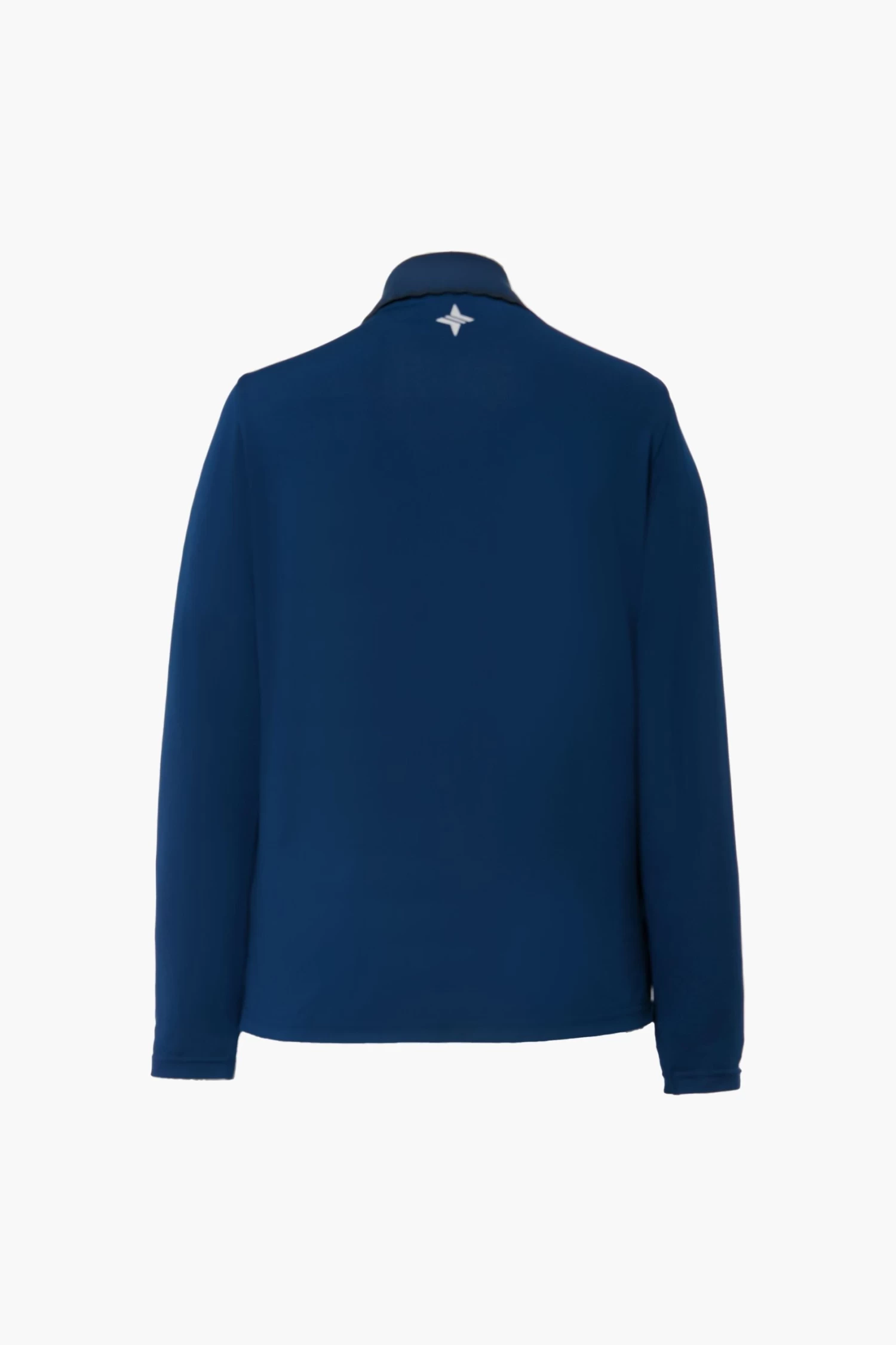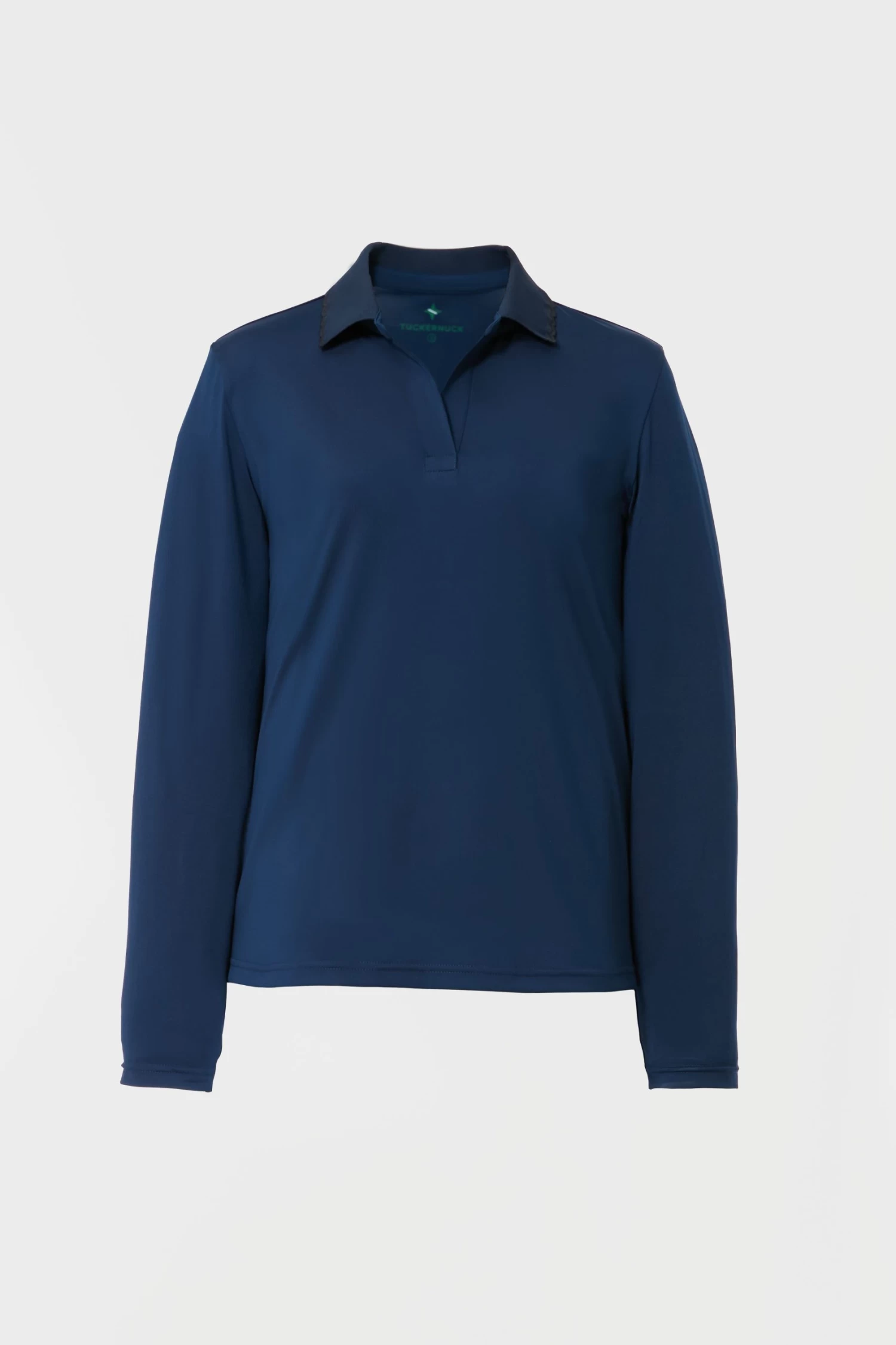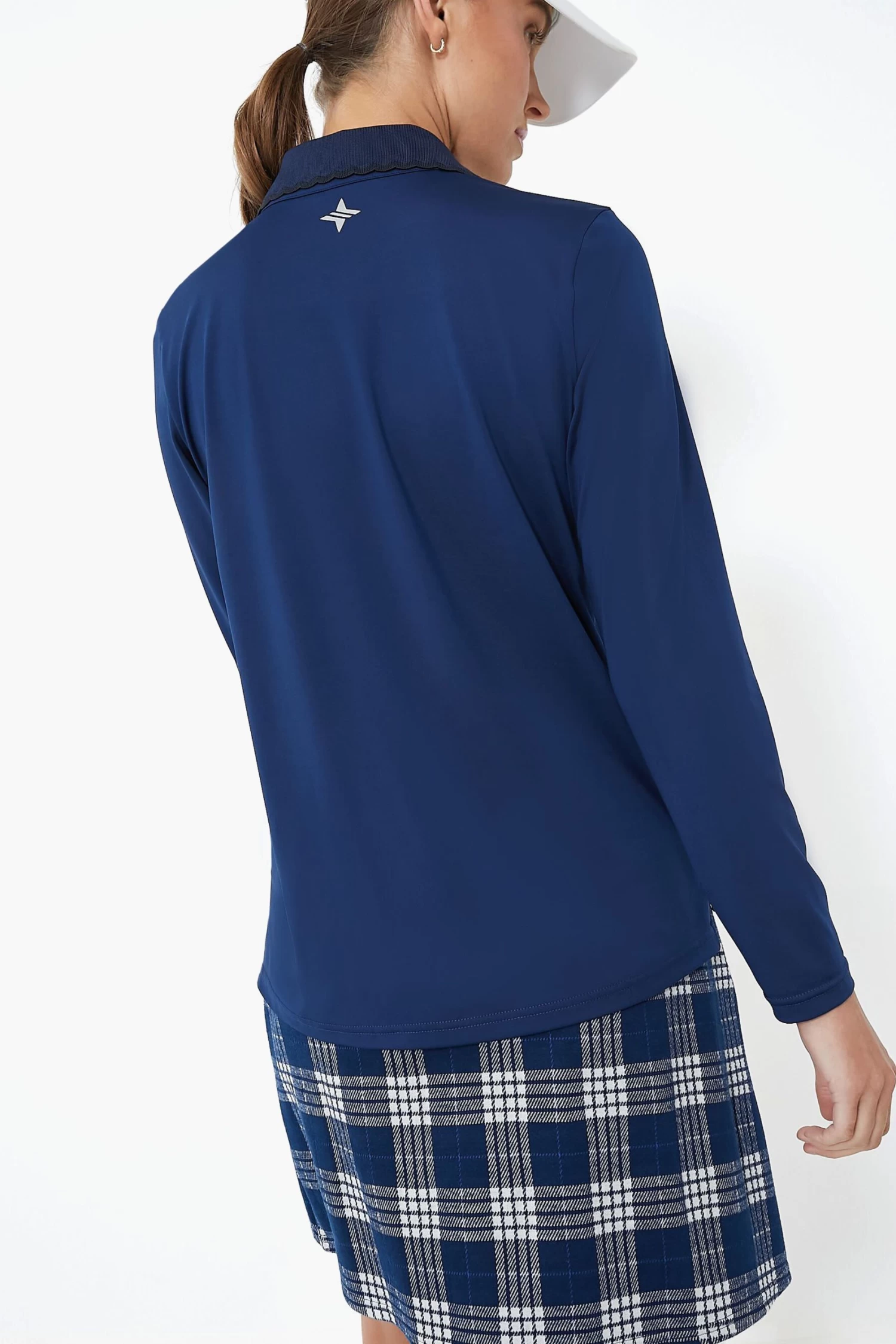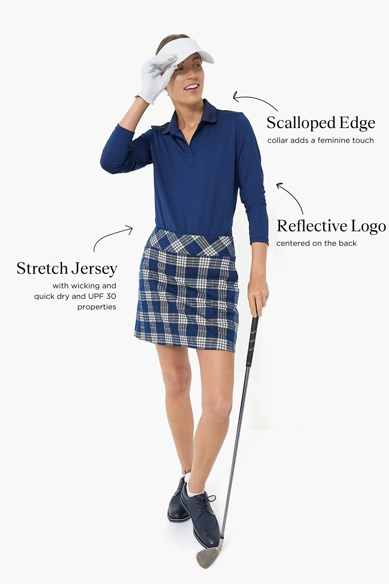 The Navy Long Sleeve Caroline Polo is a classic look with modern tailoring. Feminine scallops adorn the edge of the collar in a contrasting black hue, creating a subtle color block moment to trim out this all activities top. Featuring an open neckline, boxy fit and a split hem for tucking with ease, this piece keeps it cool even when the match gets hot. We designed this with tennis and golf in mind, but it works well for a power walk or pickleball match too!