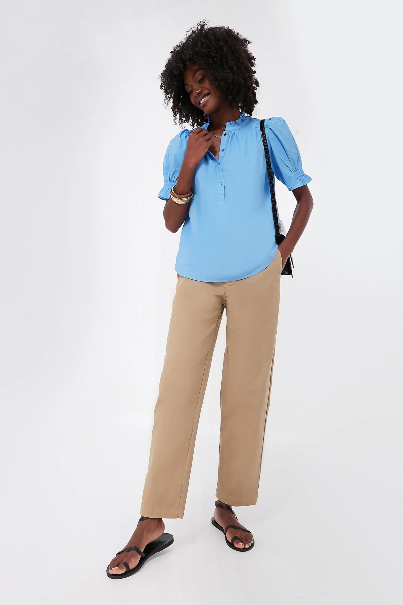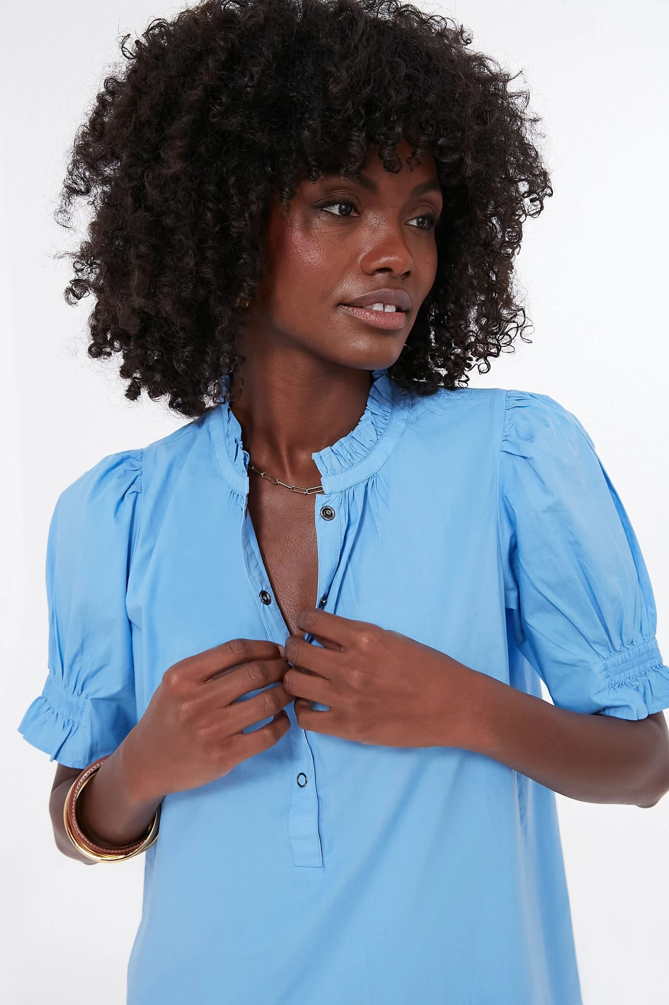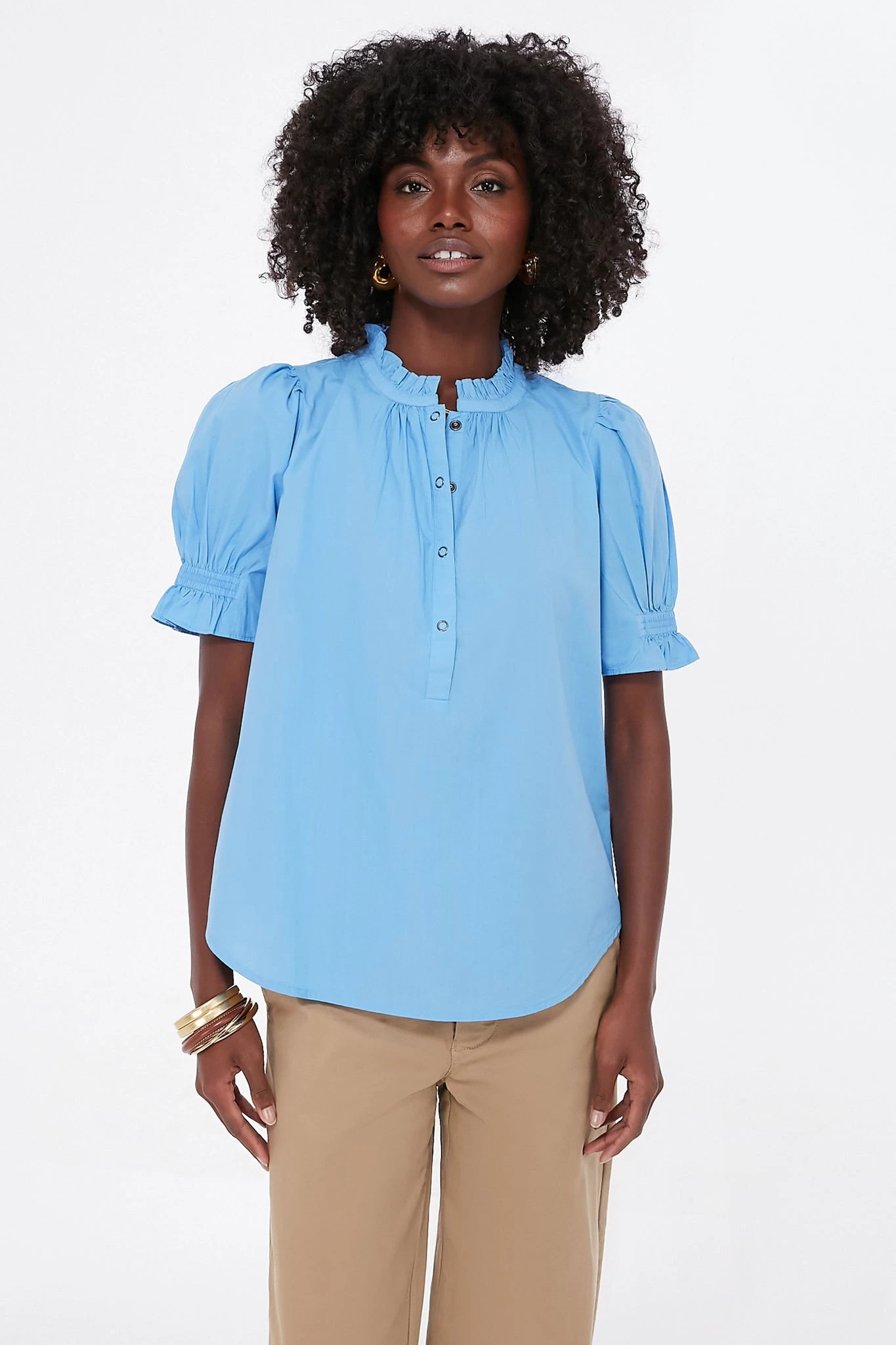 Featuring a feminine puff shoulder detail and a charming ruffled collar, the Oxford Blue Los Altos top is a simple statement piece thatâs necessary in every wardrobe. Snap buttons accent this relaxed, popover silhouette. Pair with jeans and a hat for a boho-inspired vacation look, or wear it with trousers and loafers on days in the office.