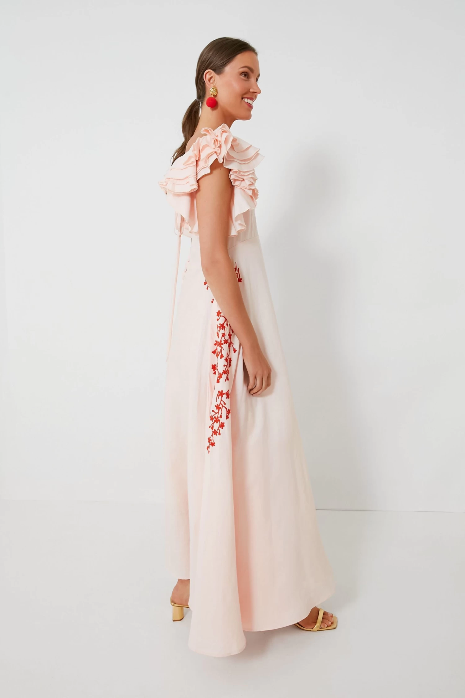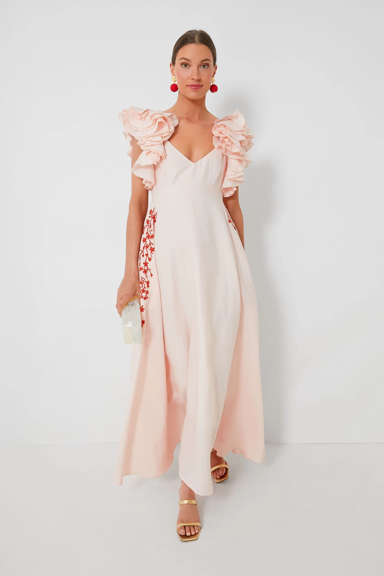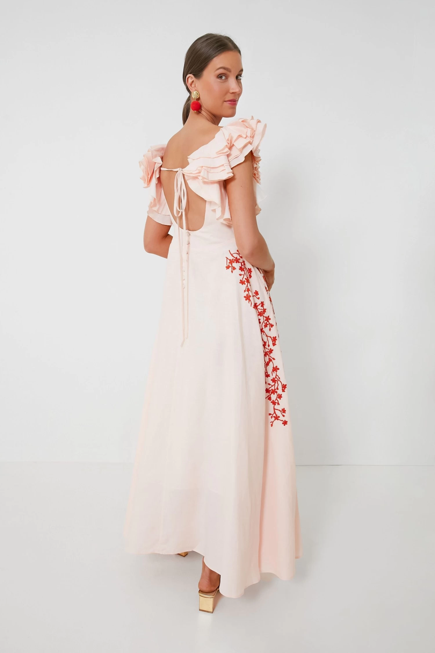 The Peach Essen Dress is the sweet and feminine silhouette we have been searching for to complete our warm-weather wardrobes. Full of elevated details like ruffled flutter sleeves that add some dimension, embroidered flowers across the sides and hips, and a scoop back with a bow detail, this maxi definitely brings out the flirty and romantic. An easy choice for any occasion and so easily dressed up with the addition of a clutch and heels, you’ll reach for this style over and over again.