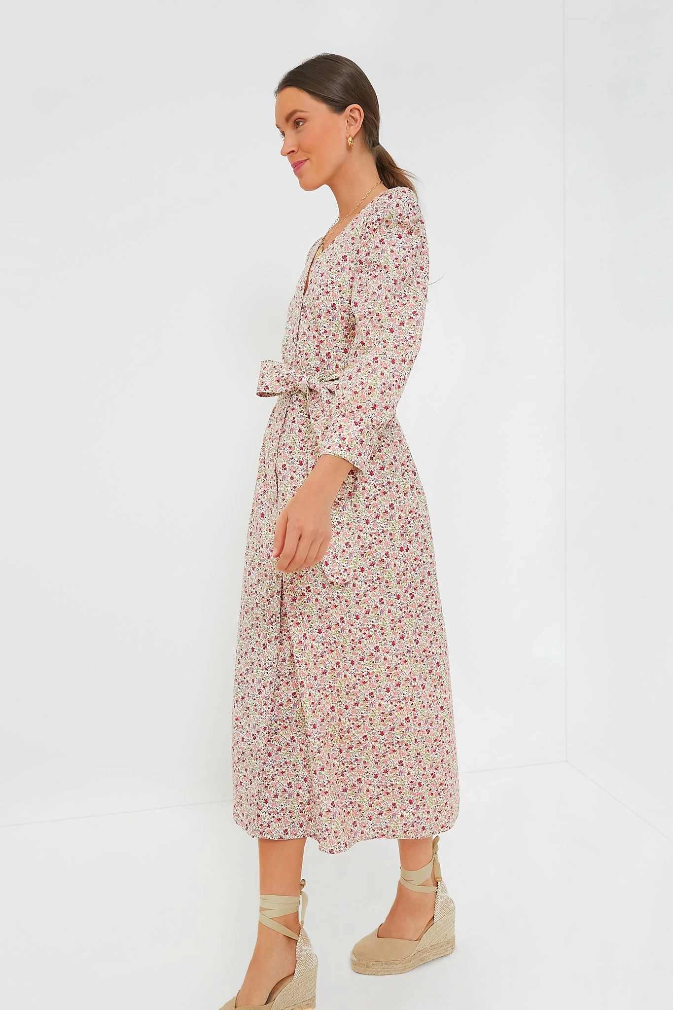 The Pink Floral Nellie Dress is a feminine classic that can be worn to all of your spring events. This maxi boasts long puff sleeves, a self-tie waist, and a front button placket, for an elegant shirtdress-inspired look. The floral pattern is graceful and delicate- all that is needed is statement earrings and wedges for a lovely day-to-night look!