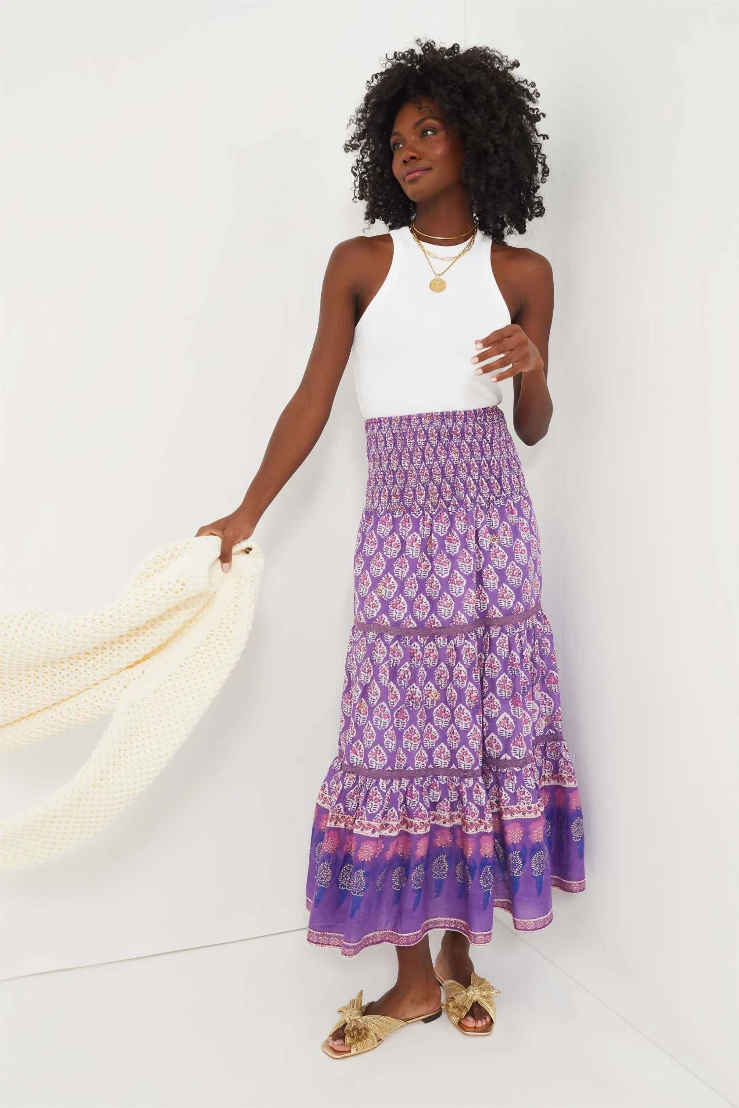 Graceful, elegant, and feminine – the Purple Print Mandy Skirt is everything we want in a skirt and more! This maxi features a smocked waistband, matching border inserts, ruffled hem, and tiered skirt bringing flowy movement that we can’t get enough of. The whimsical floral design is the star of the show- style it with the matching Purple Print Angel Top for a cute co-ordinating ‘fit or pair with a simple bodysuit, heels and a bucket bag for a chic boho look.