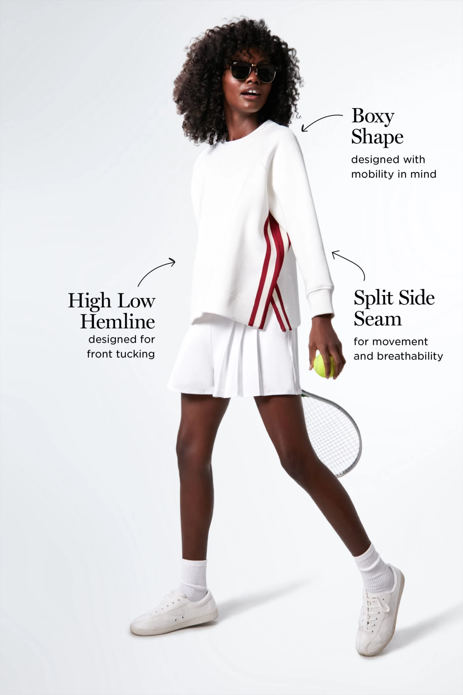 The perfect outfit topper to take you from a warm-up run to a coffee run, the Retro Red and White Maggie Pullover was designed with mobility in mind. Crafted from a breathable cotton blend fabric, this nostalgic-filled crewneck is a crisp, cool completion to any look. Detailed with red stripe trim on the sides with high rise slits for extra room, a boxy cut bodice, this soft to the touch top pairs perfectly with leggings, shorts, and performance skirts for an all-activities piece (even if that activity is curling up on the couch with a good read)!