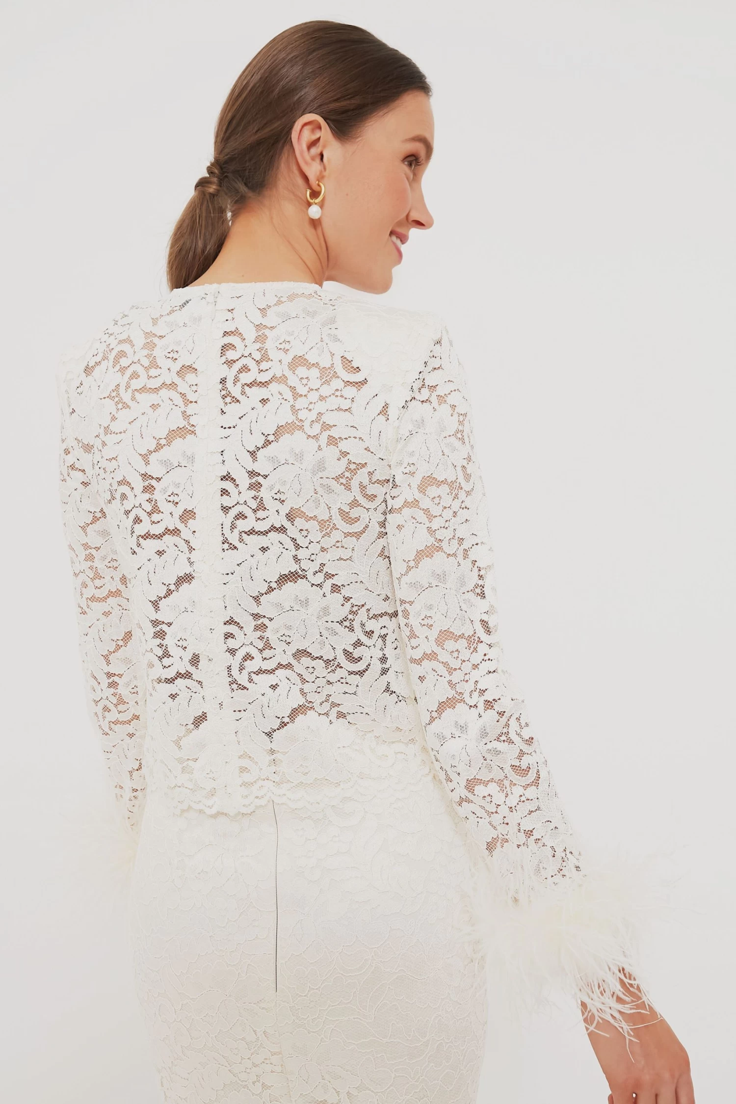 The romantic feel of cream cord lace meets a sleek silhouette in the Cream Cord Lace Feather Top, further accented with statement feather cuffs. This luxurious style is sure to make a statement however you style it. Pair it with jeans and stilettos for a night out with the girls, or with a mini skirt and boots for a flirty dinner date.
