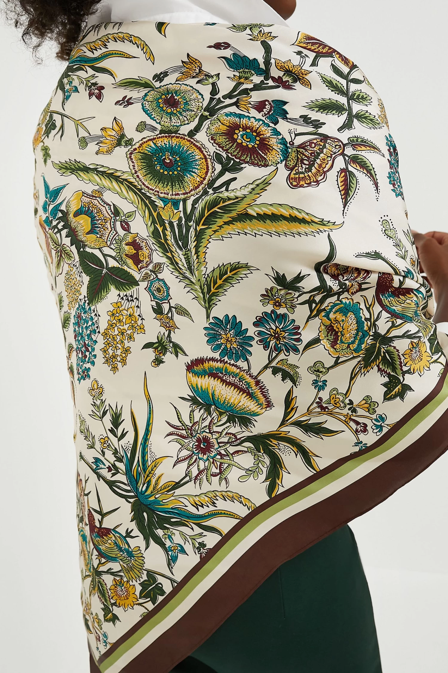 Striking a balance between our mini scarves and our larger ones, the Sharp Floral Medium Silk Scarf is the perfect go-to when you need a pop of color. Versatile enough to be tied around the neck or worn over the shoulders like a shawl, this stunning style is adorned with one of our custom prints for a special touch. Spice up a neutral look with this darling number, make it a bold addition by pairing with brights, or gift one to a friend if you’re feeling extra nice!