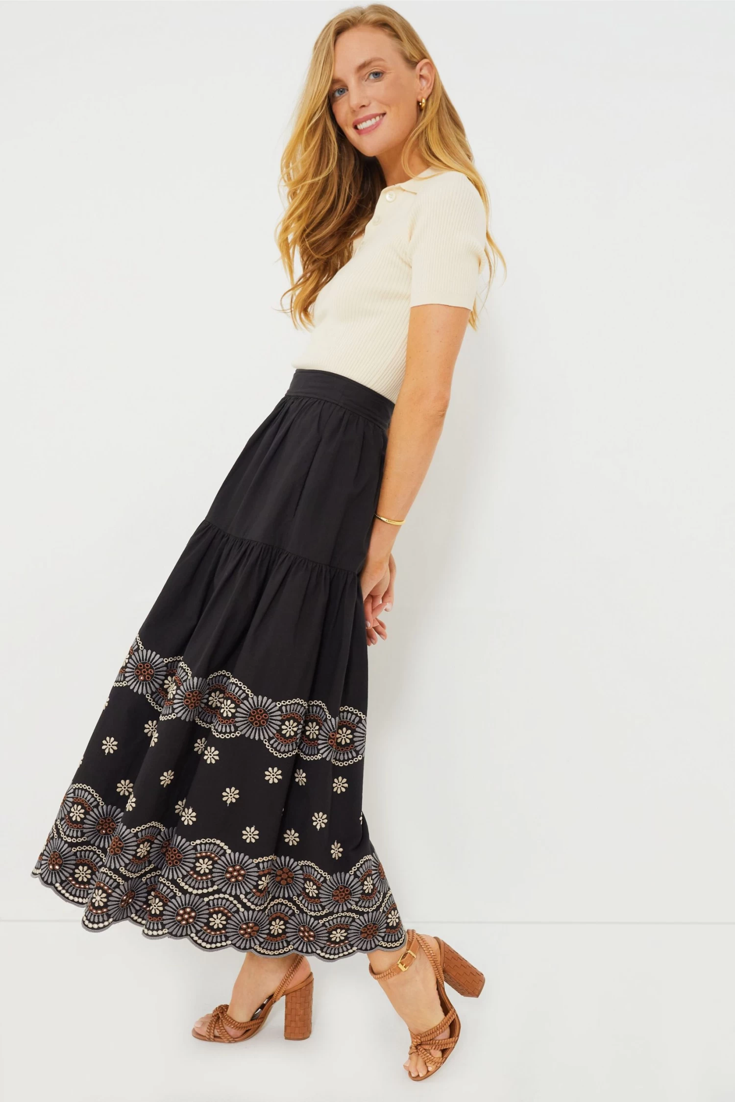 The Noir Aoda Skirt is an simple silhouette with intricate details that make it stand out in a crowd. With a tiered, A-line silhouette that is adorned with embroidered designs around the bottom, this elegant beauty can be worn to countless occasions. Pair with heels and gold jewelry for a formal dinner, or with flats and a simple tee for going to lunch!