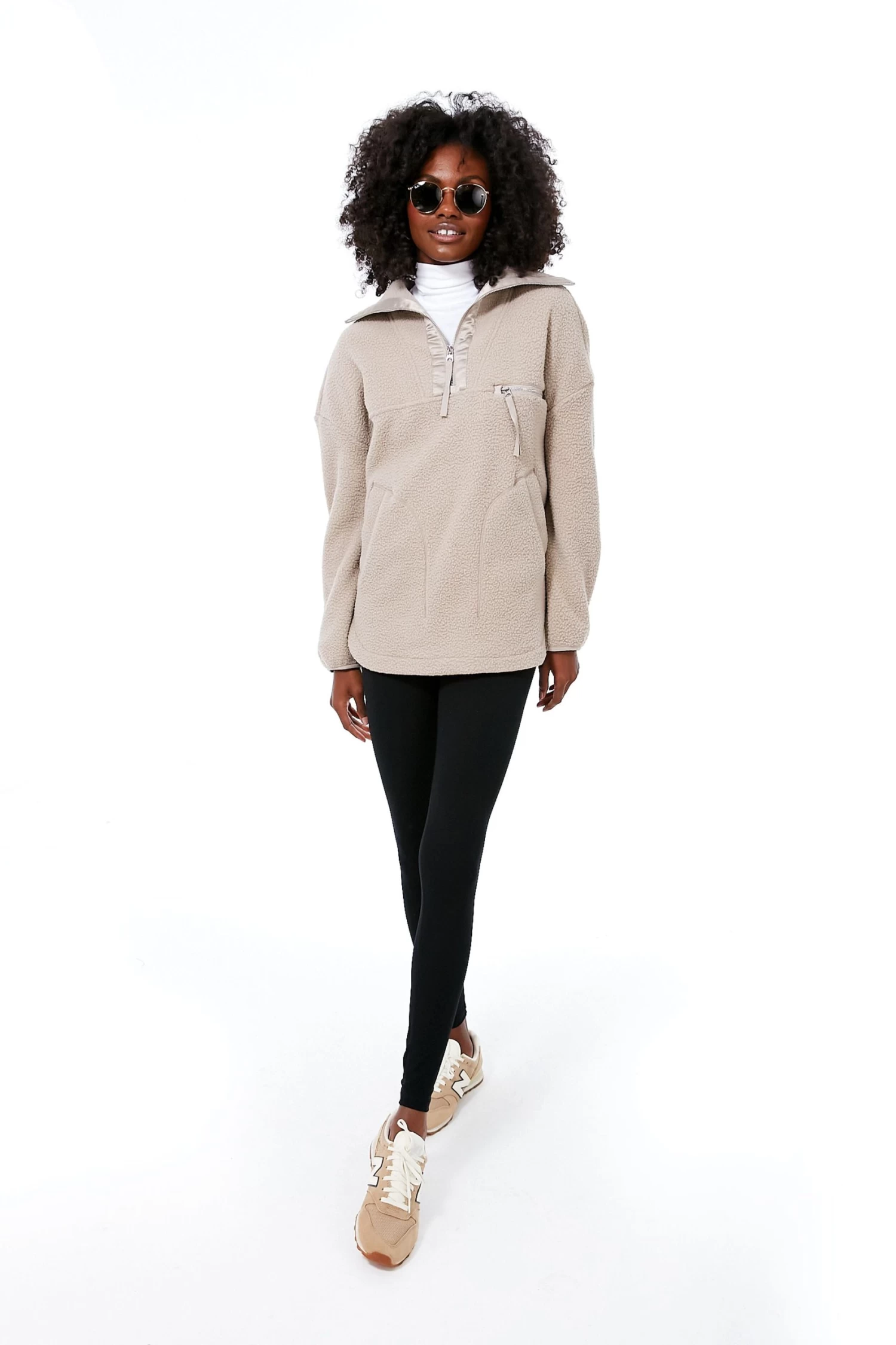 Designed for supremely stylish layering, this versatile knit can be thrown on over everything from active sets to the everyday denim and tee. Crafted in a warm, lightweight and 100% recycled Plush Borg Fleece, this versatile, elegant and sateen-trimmed popover jacket has an oversized, easy fit, a half-zip collar and a curved, mid-length hem.