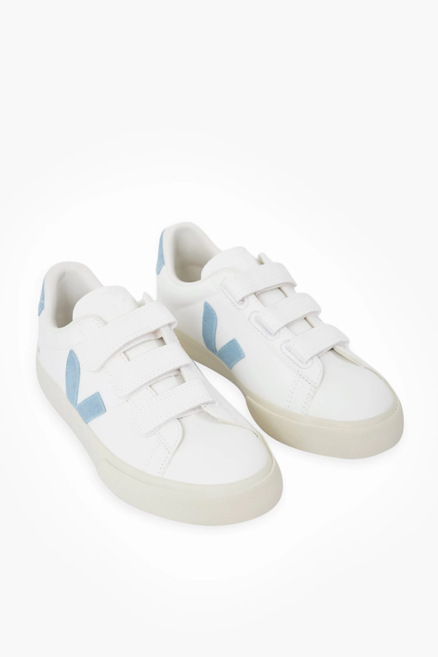 The Extra White White Steel Recife Logo Sneakers feature chrome free leather from Brazil that is smooth, light, and free of toxic products. Not only can you feel good about the environmental impact, but you’ll also want to strut in these trainers all day long. With a light blue contrast suede patch and three velcro straps, these playful shoes will instantly brighten up any outfit from denim to dresses.