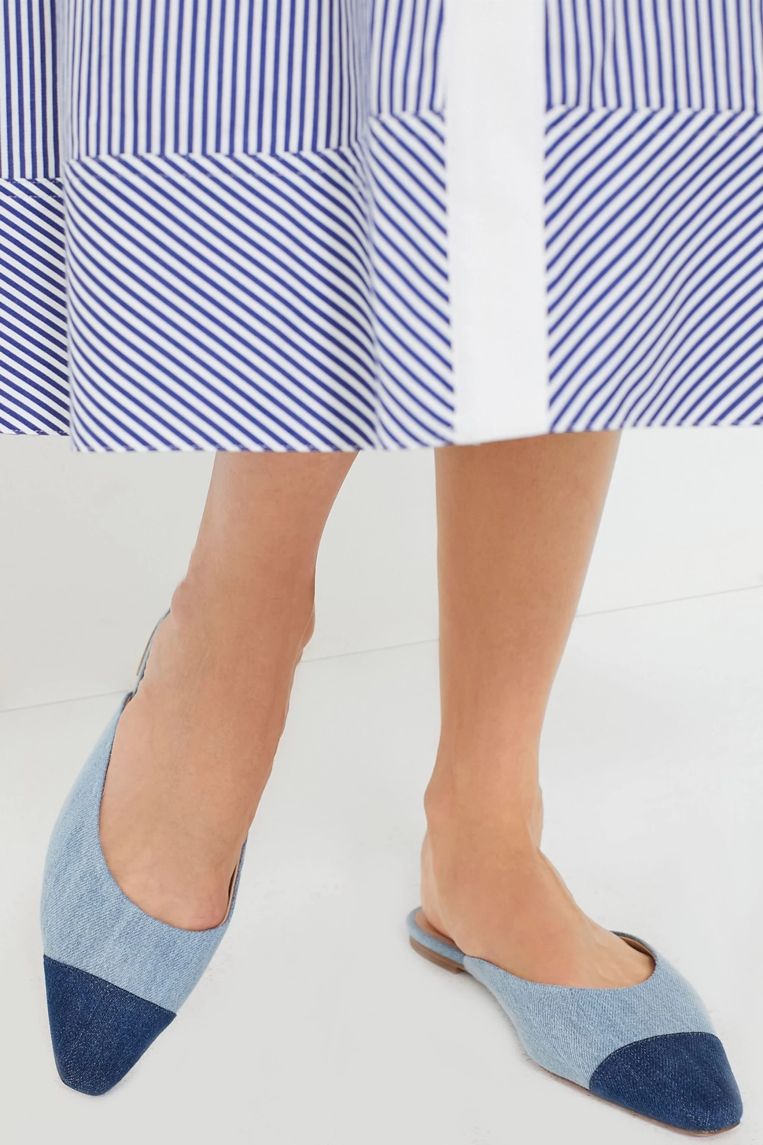 Defined by its cap-toe design, the Carlotta flat in two-tone denim channels effortless elegance with its slide-on silhouette. Crafted from a denim upper and leather footbed, this sophisticated style merges comfort and style with its polished practicality for everyday and beyond. Go for an all denim look by pairing them with your favorite jeans and jean jacket!