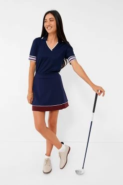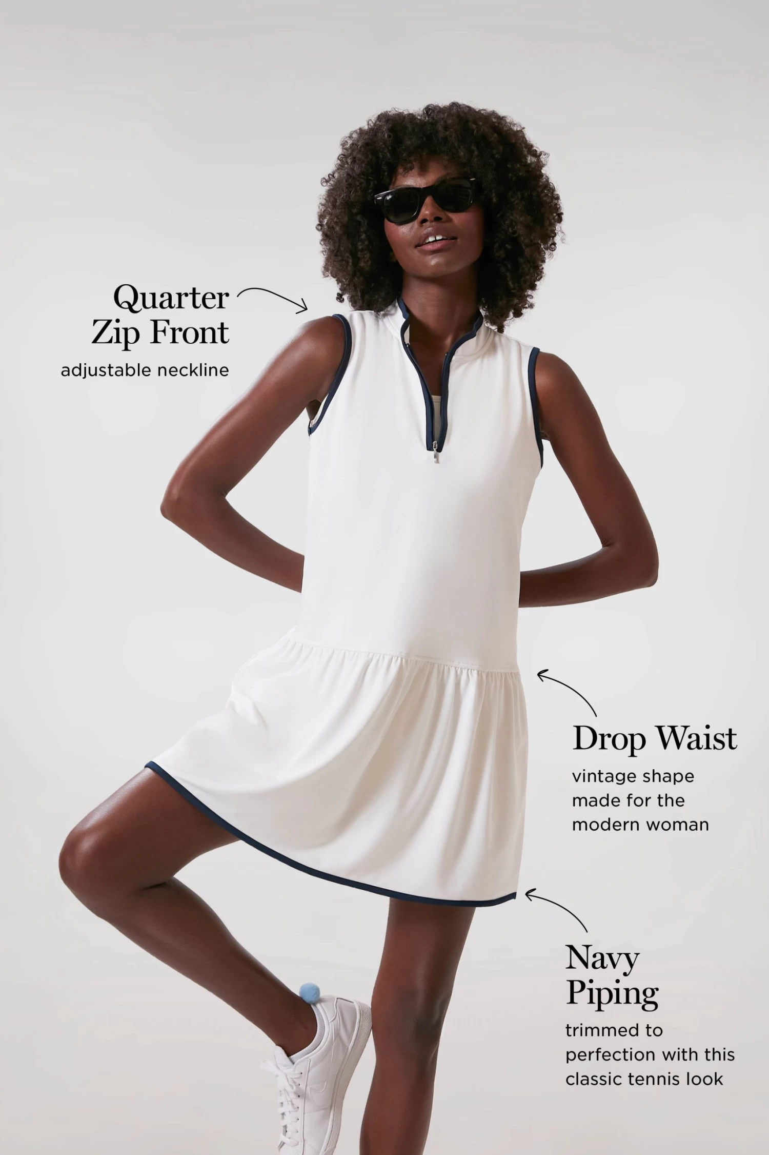 Vintage inspired but updated for the modern woman, this quarter zip, drop waist tennis dress brings the heat on and off the court. The chic mandarin collar accented with a navy blue piping is simple and streamlined to compliment the swing skirt and boxy shape. Style with the Blue Bouquet Sports Bra and Compression Shorts for a feminine, floral touch to this classic and clean look.