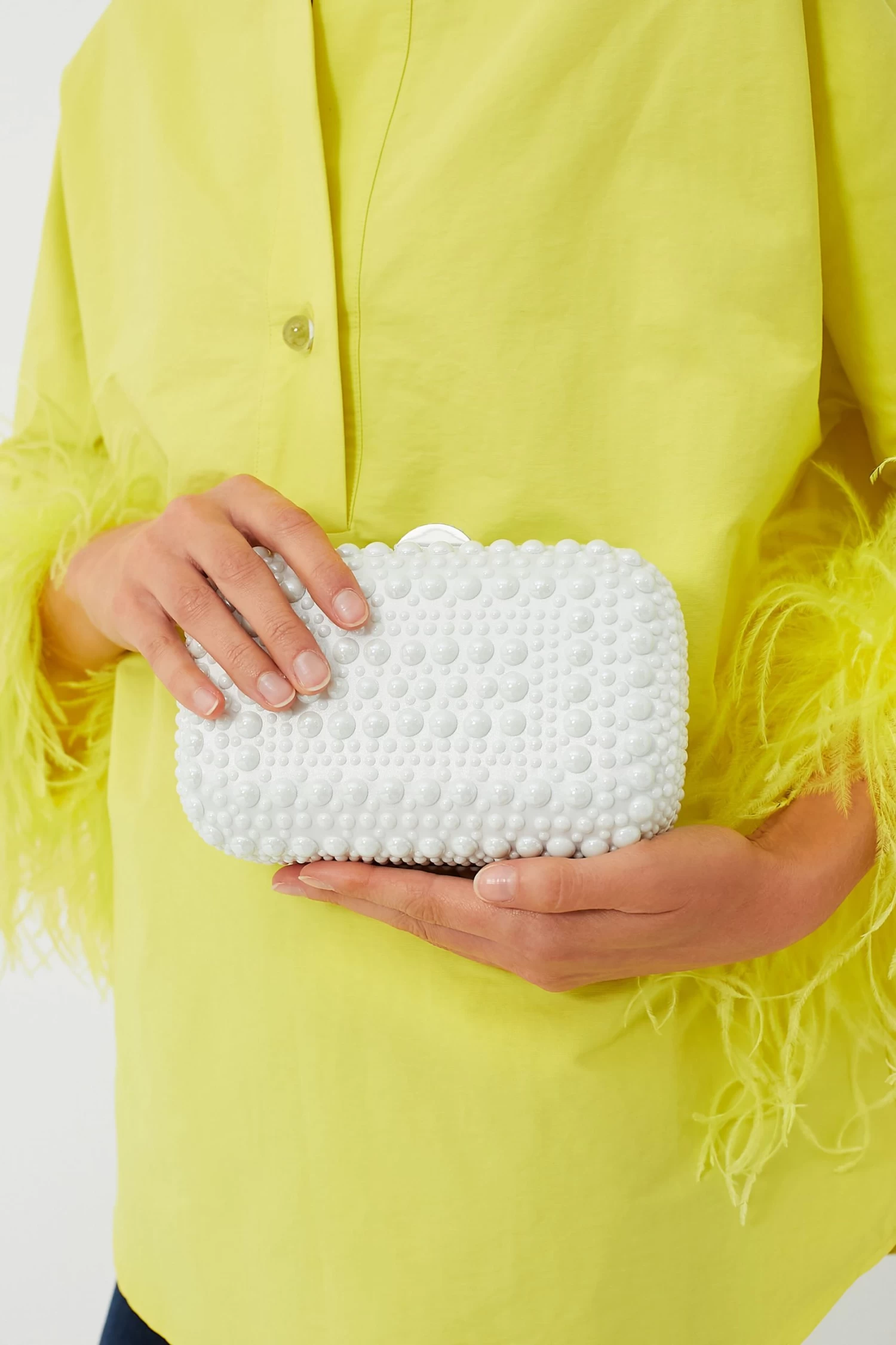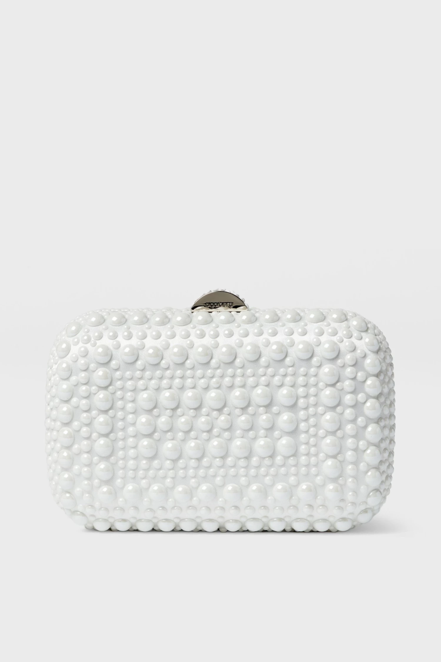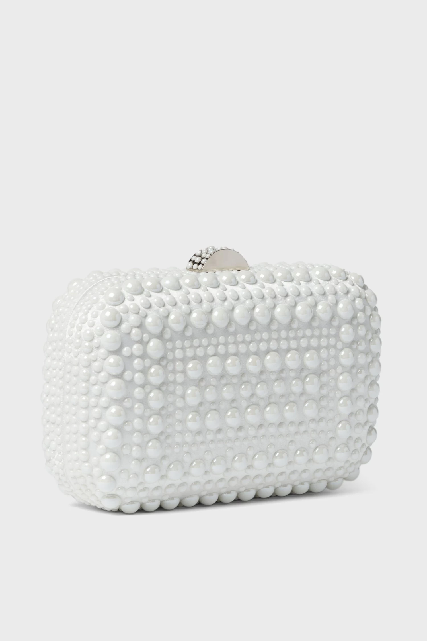 Crafted from luxe satin and accented by a domed hotfix embellishment and an encrusted block lock closure, the White Ari Hotfix Clutch is a stunning piece that exudes elegance. With its hard case and long shoulder chain, it makes the perfect accessory for formal occasions.