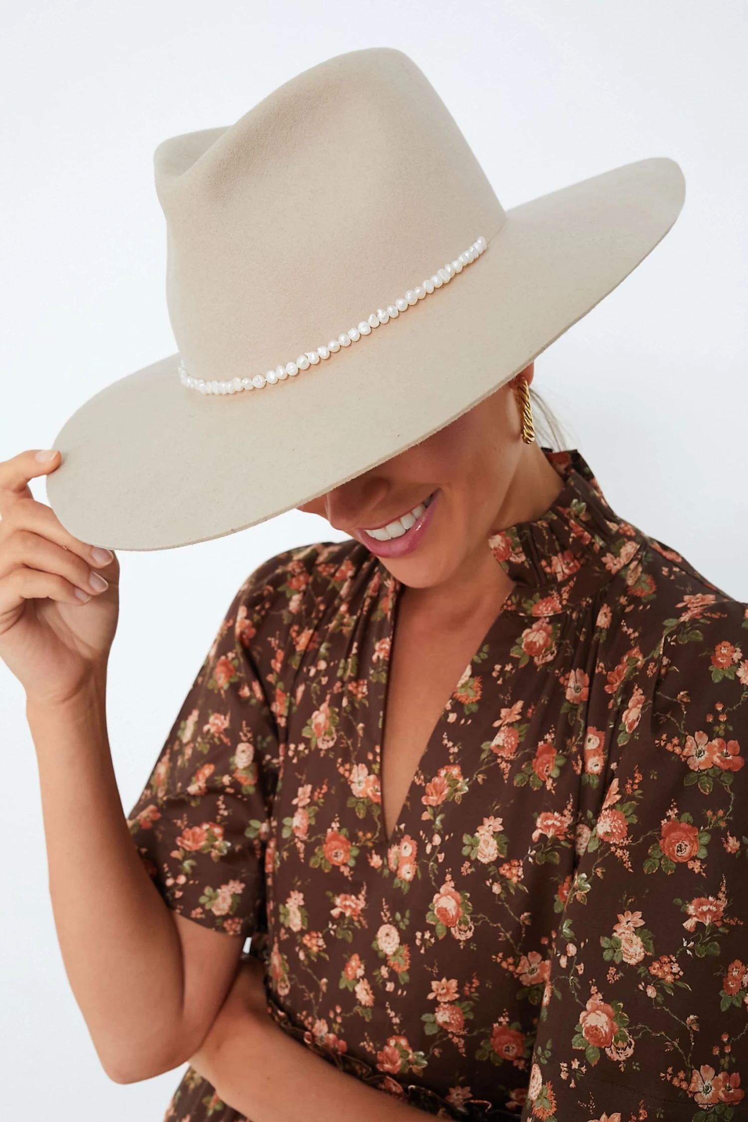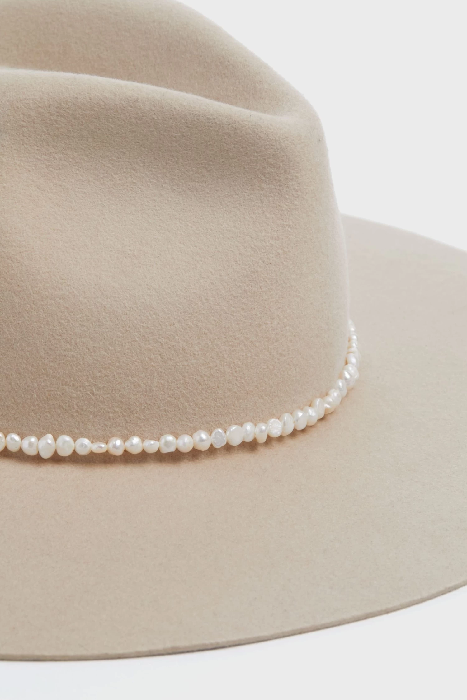 Head out West with the Oatmeal Gretchen Hat! Beautifully crafted from Australian wool felt, this wide brimmed beauty is complete with a gorgeous sea pearl trim detail around the crown for a feminine touch. Perfect for extra sun coverage and adding a unique finisher to any outfit, style it with flowy midi dresses and boots for a sweet ensemble, or with denim for outdoor adventures.